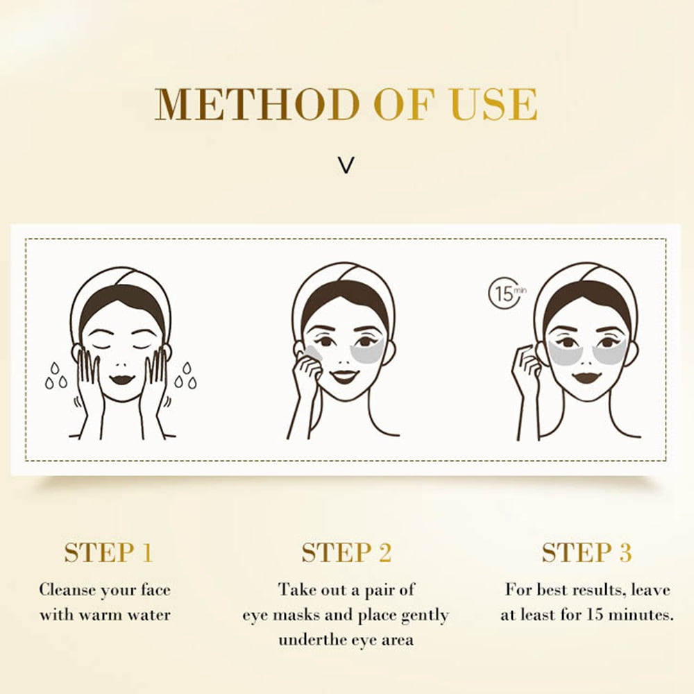 24k gold is used as a luxury skincare ingredient all over the world. With a great deal of anion, the active 24k gold has the ability to expel harmful toxins, increase blood circulation and improve cellular metabolism, thus promote following absorption, resist aging and lighten dark circle. Moreover, gold is mild and stable. Added with 24k gold, this eye mask can also make skin sooth and healthy, perform bigger and brighter eyes.