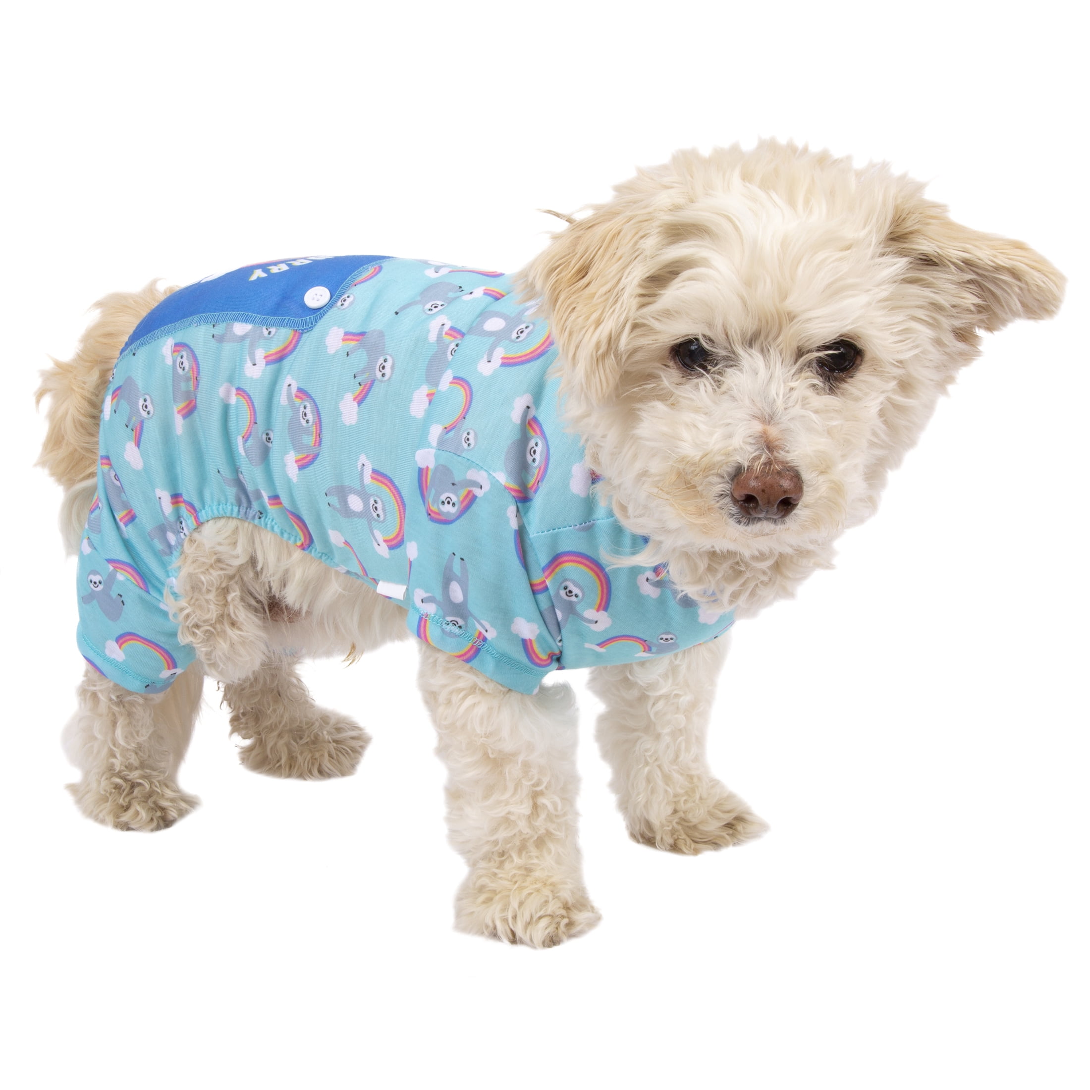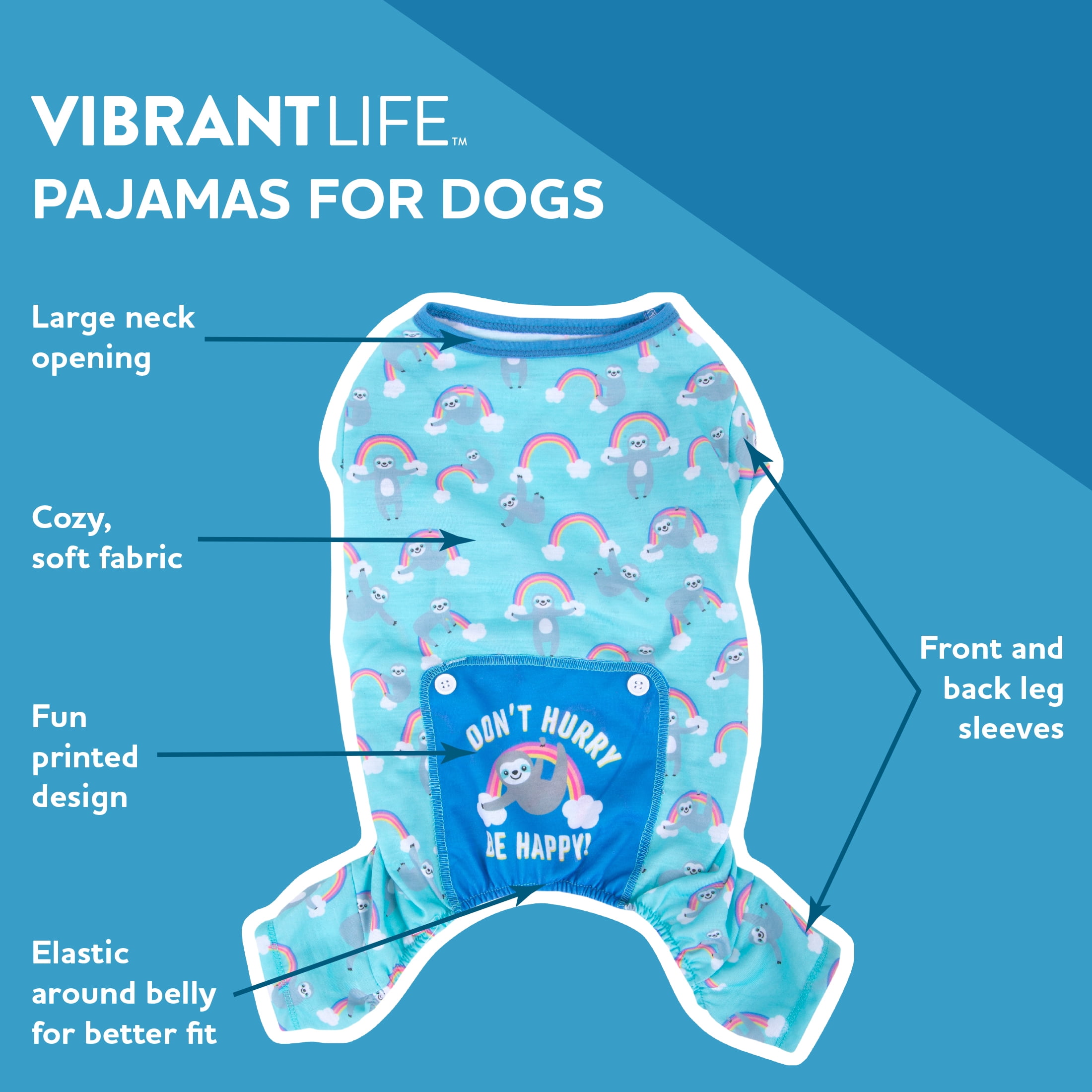 Vibrant Life Rainbow Sloth pajama Small is perfect for your little dog. This pajama has a cute little sloth and rainbow all over print with a flap on the rear stating "Don’t Worry Be Happy". Wear this pajama while lounging around the house or out for a neighborhood walk. These pajamas have elastic around the belly as well as around the legs to help keep them in place. Help your pets live the Vibrant Life! Our products are specially crafted with one goal in mind, seeing your pet at its very best. With a variety of offerings designed to keep animals healthy, happy, and energized. Vibrant Life stands out as the brand that truly puts your pet first.RAINBOW PRINT SLOTH PAJAMA: Size Small. From Vibrant Life. Lightweight fun blue rainbow print sloth pajamas with cute statement "Don’t Worry be Happy" FOR MOST DOGS 10 TO 20 POUNDS: This one’s for the small pups weighing 10-20 pounds. Best fits pet sizes similar to Jack Russell Terrier, Shih Tzu, Pug BACK MEASURES 13 INCHES: Breed sizes do vary, so measure your pet before purchasing. Back length up to 13 inches PULLOVER STYLE: Just like a human hoodie, this pulls over the head, paws through the armholes. No other closures. REINFORCED LEASH OPENING ON NECK: For use with a collar or harness, worn underneath. HAND WASH: Hand wash inside out in cold water. Do not bleach. Lay flat to dry