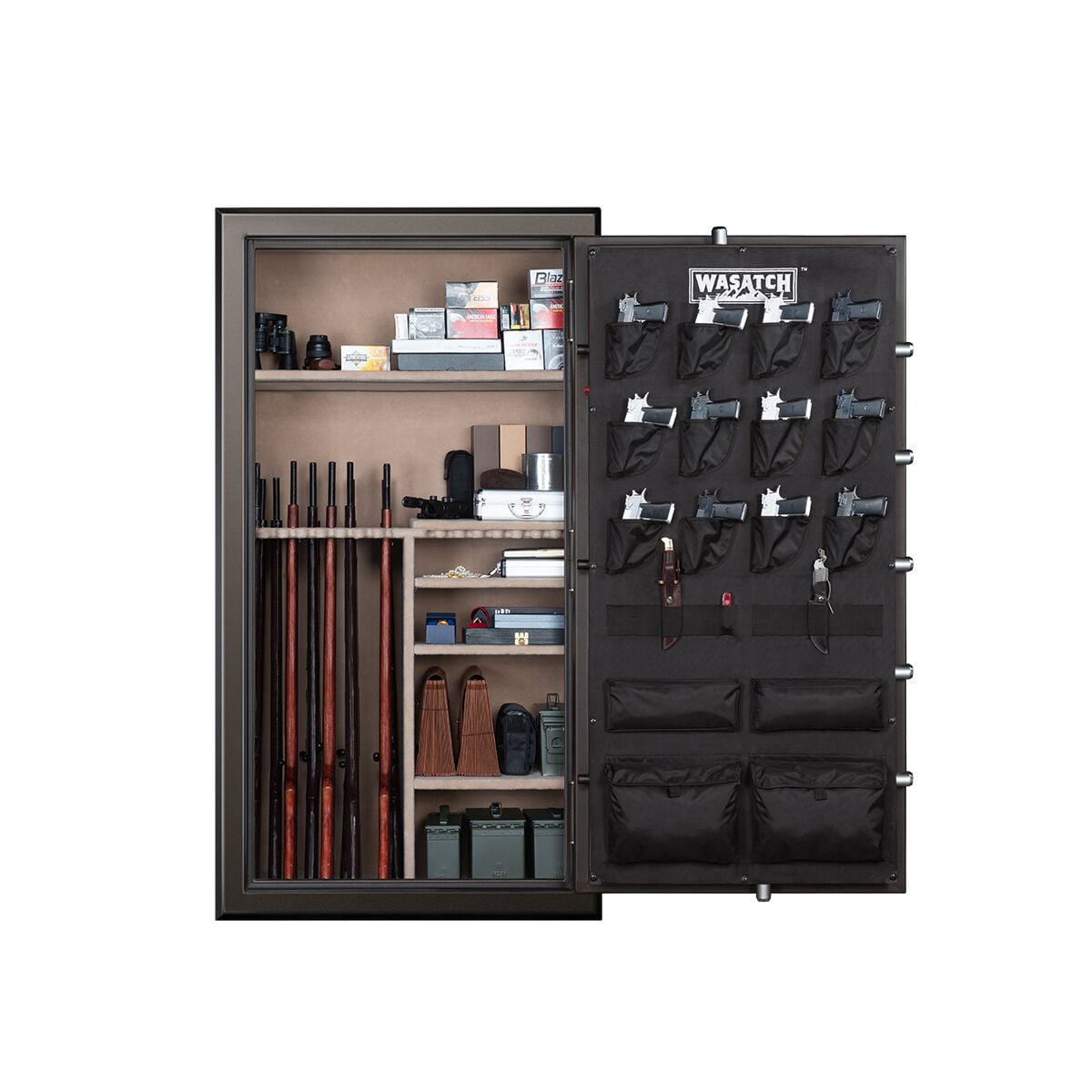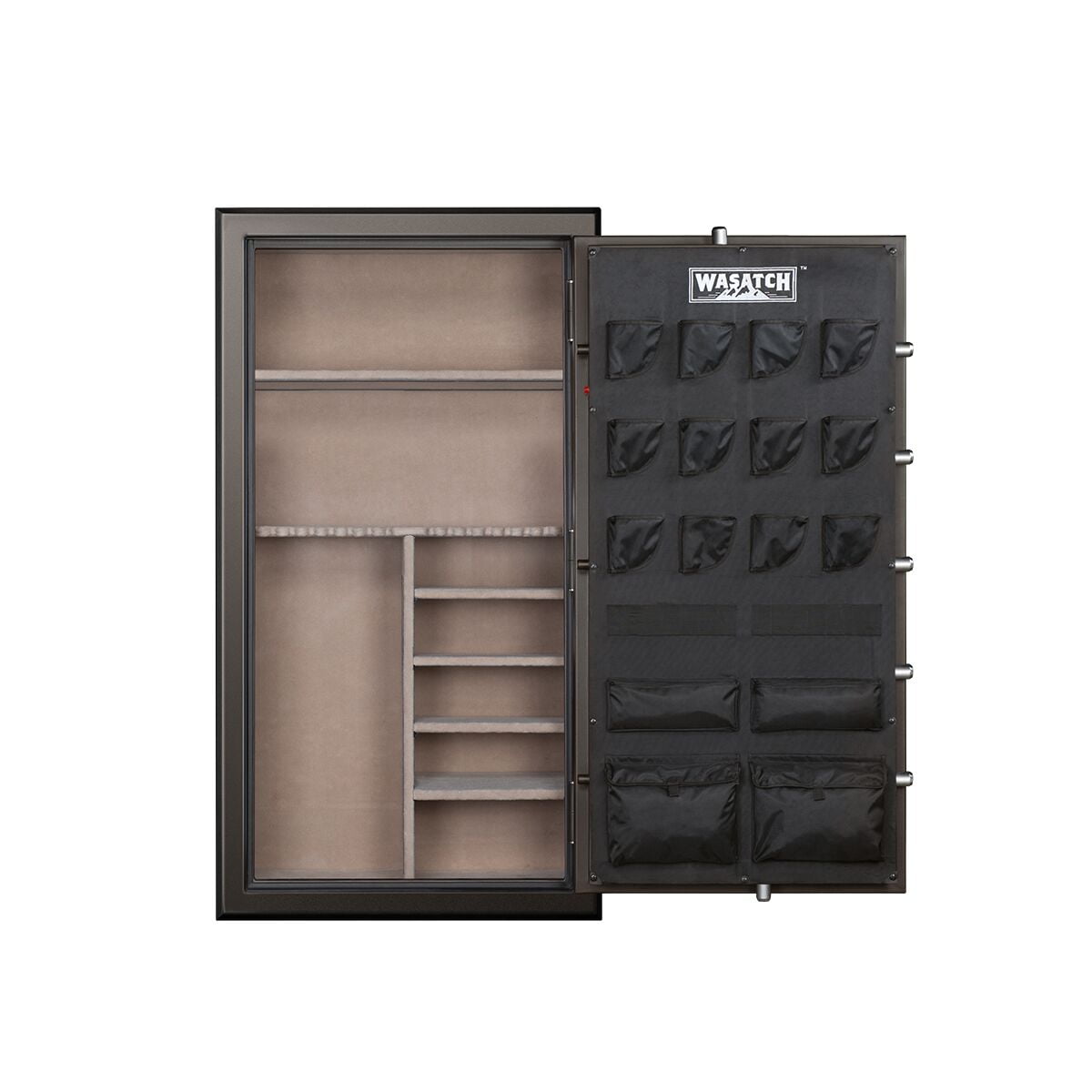 Just like the Wasatch Mountain range, this Wasatch long gun safe provides the strength, beauty and appreciation you expect in your safe. This Wasatch model 64EDBW has a fire rating of 1400 degrees Fahrenheit for 30 minutes and is waterproof up to 2 feet of water for 72 hours. It features an easy to program electronic lock with alarm U function, factory installed door storage with pouches to accommodate your handguns and pockets to store documents and other accessories. The Wasatch 64 gun safe has attractive beveled edges and 7-1.5" live action locking bolts to provide greater security in protecting your shotguns, rifles, handguns and valuables. This 64-gun safe is 72" high and includes 2 full length shelves and 3 half shelves to maximize your secure storage space. All Wasatch gun safes offer extra protection with recessed doors and tapered bolts for increased pry resistance and bolt down kit. The Wasatch series of safes provide unmatched features for the price.