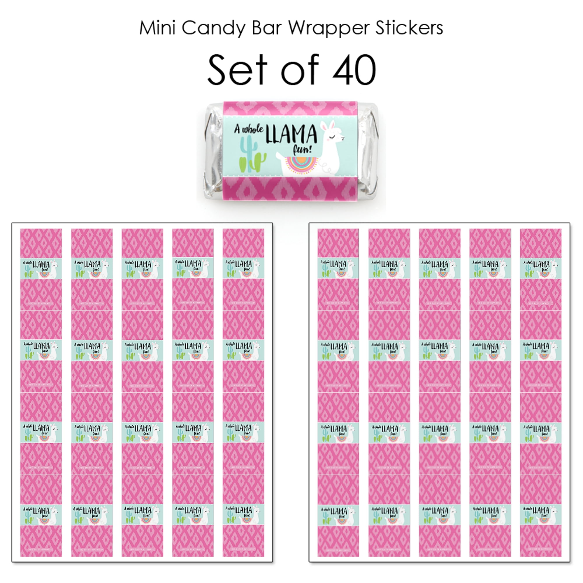 Whole Llama Fun Mini Candy Bar Wrappers INCLUDES 40 candy stickers, perfect for styling an adorable llama fiesta candy buffet or unique baby shower or birthday party favors. Whole Llama Fun mini candy bar wrappers MEASURE 1.25” wide x 2.75” high and will quickly add a personal touch to all your sweet treats. It is easy to wrap Hershey’s® Miniature candy bars with these cute Whole Llama Fun stickers!