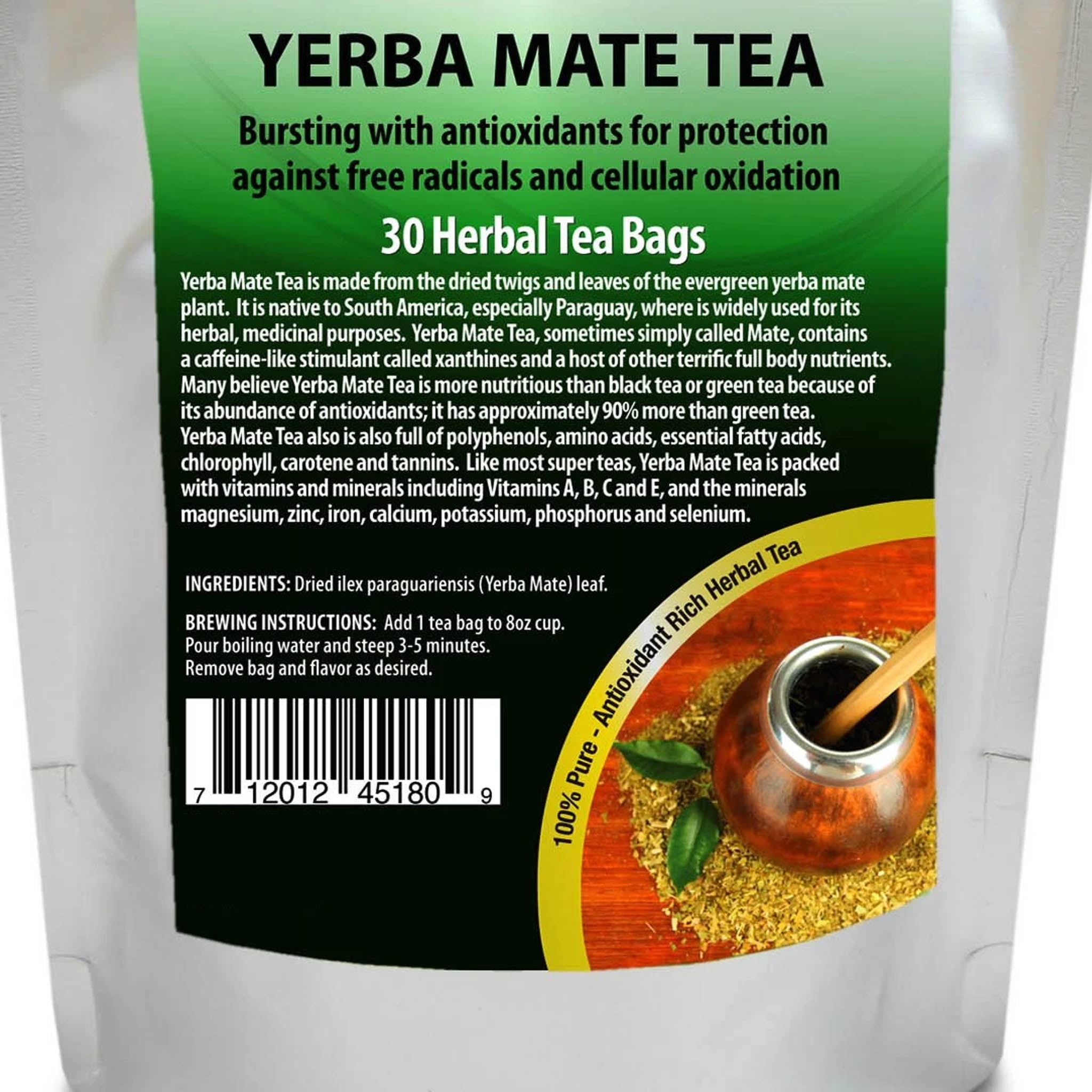 Yerba Mate Tea is a specialty tea from South America made by fire-drying the twigs and leaves of the yerba mate plant, an evergreen shrub. It contains xanthines, a body-stimulating compound similar to caffeine that is less likely to give jittery side effects. Yerba Mate Tea is a potent source of vitamins and minerals ranging from Vitamin A, many varieties of Vitamin B, Vitamin C and Vitamin E, to the minerals calcium, potassium, iron, phosphorus, selenium and magnesium. It also contains tannins, polyphenols, 14 amino acids, essential fatty acids, carotene and chlorophyll, each of which supports healthy bodies. In its native subtropical homelands and beyond, Yerba Mate Tea is used as an herbal remedy for many digestive issues. How to Take Yerba Mate Tea Yerba Mate Tea is a wonderful nutritional supplement for the entire body. It’s recommended for anyone seeking sustained energy, weight loss assistance and an overall stronger body and mind. When combined with a healthy diet and active lifestyle, Yerba Mate Tea will yield the best results. Drink two or three cups of Yerba Mate Tea daily with any of your favorite tea additives. INGREDIENTS: Dried Ilex paraguariensis leaf. SUGGESTED USE: We recommend drinking 2-3 cups of Yerba Mate tea per day. Yerba mate tea is most effective when combined with a healthy diet and daily exercise. If you are pregnant or breast-feeding you should consult with a doctor before use. If you are on any medications check with your doctor, or pharmacist before taking any supplement. These statements have not been evaluated by the FDA. This product is not intended to diagnose, test, cure or prevent any disease.