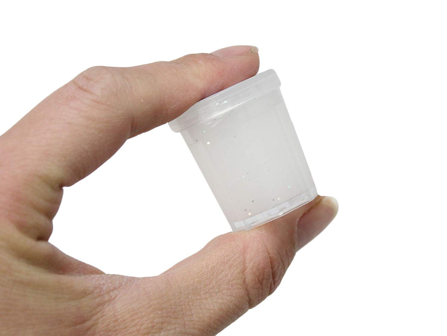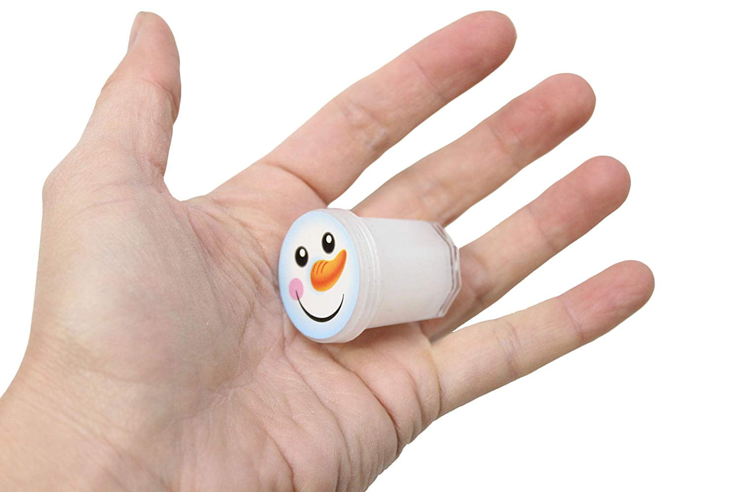 - Each slime comes in a 1.25" x 1" plastic container with lid. Lids have adorable snowmen printed on them.