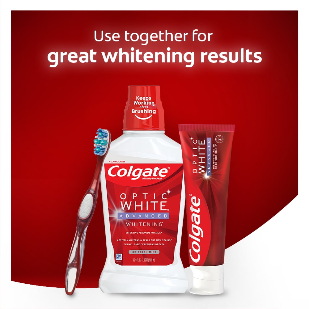 - Optic White Advanced deeply whitens up to four shades* and helps whiten teeth both inside and out (*when brushing twice daily for 6 weeks)