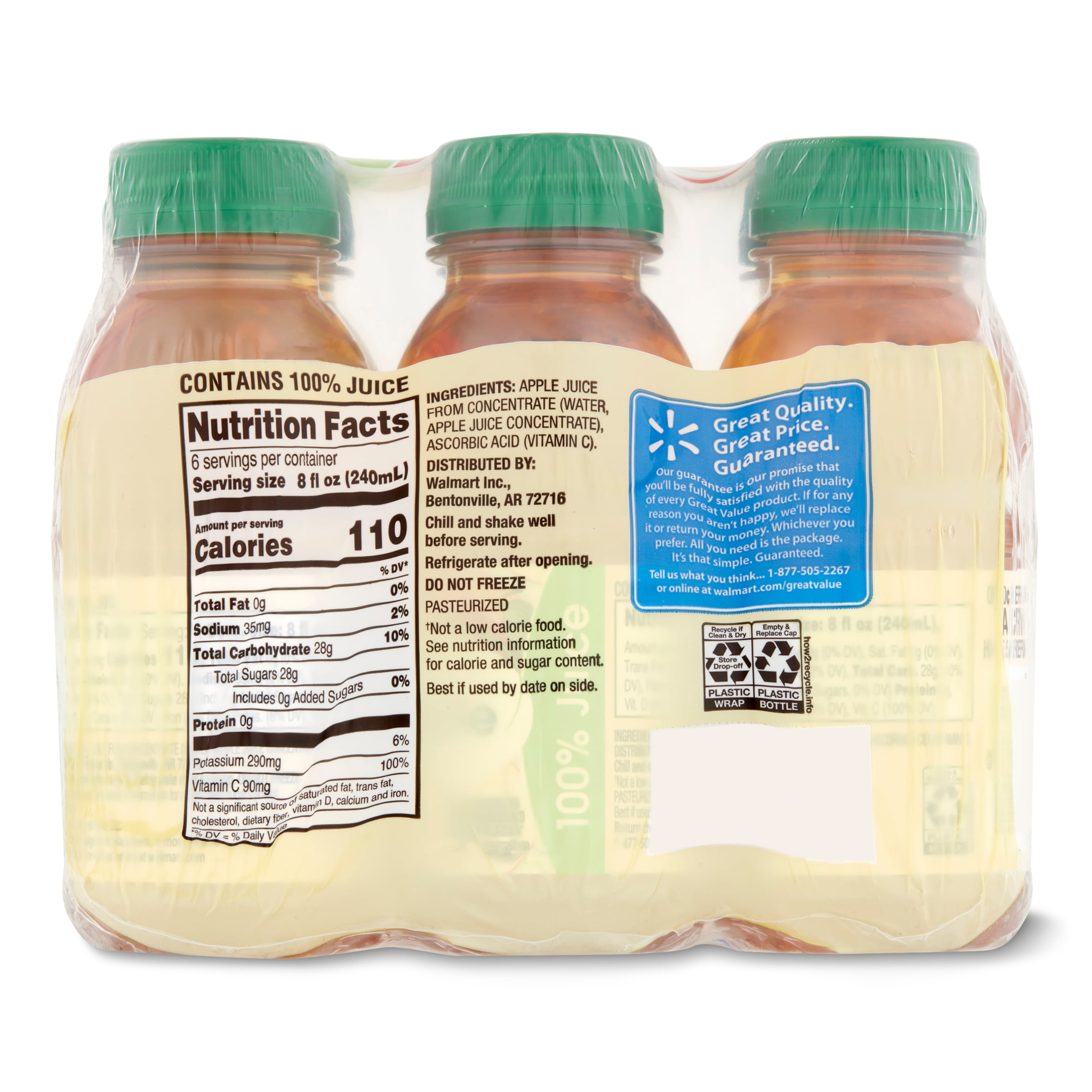 Apple Juice form Concentrate with Added IngredientNo sugar added**Not a low calorie food.Great Value Apple 100% Juice is a delicious beverage that delivers a burst of refreshing, crisp apple flavor that you will enjoy with every sip. This juice has no added sugars and also offers a nutritional boost as it delivers 130% of the daily recommended value of vitamin C in each serving, making it great for your health. Great Value Apple 100% Juice is a great beverage option for any health-conscious individual as our juice is made with natural ingredients, no added sugar, and only has 110 calories per serving. The 8-fluid ounce bottles are ideal for lunches or a family on the go. This juice combines great taste and quality ingredients so you can enjoy an incredible value at a great price. Treat yourself to the great taste of Great Value Apple 100% Juice.Great Value products provide families with affordable, high quality grocery and household consumable options. With our wide range of product categories spanning grocery and household consumables, we offer you a variety of products for your family’s needs. Our products are conveniently available online and in Walmart stores nationwide, allowing you to stock up and save money at the same time.130% vitamin C daily value per serving(6) 8fl oz bottlesApple juice from concentrateNo sugar addedContains 100% juice110 calories per serving0g total fatChill and shake well before servingPasteurizedGluten-free