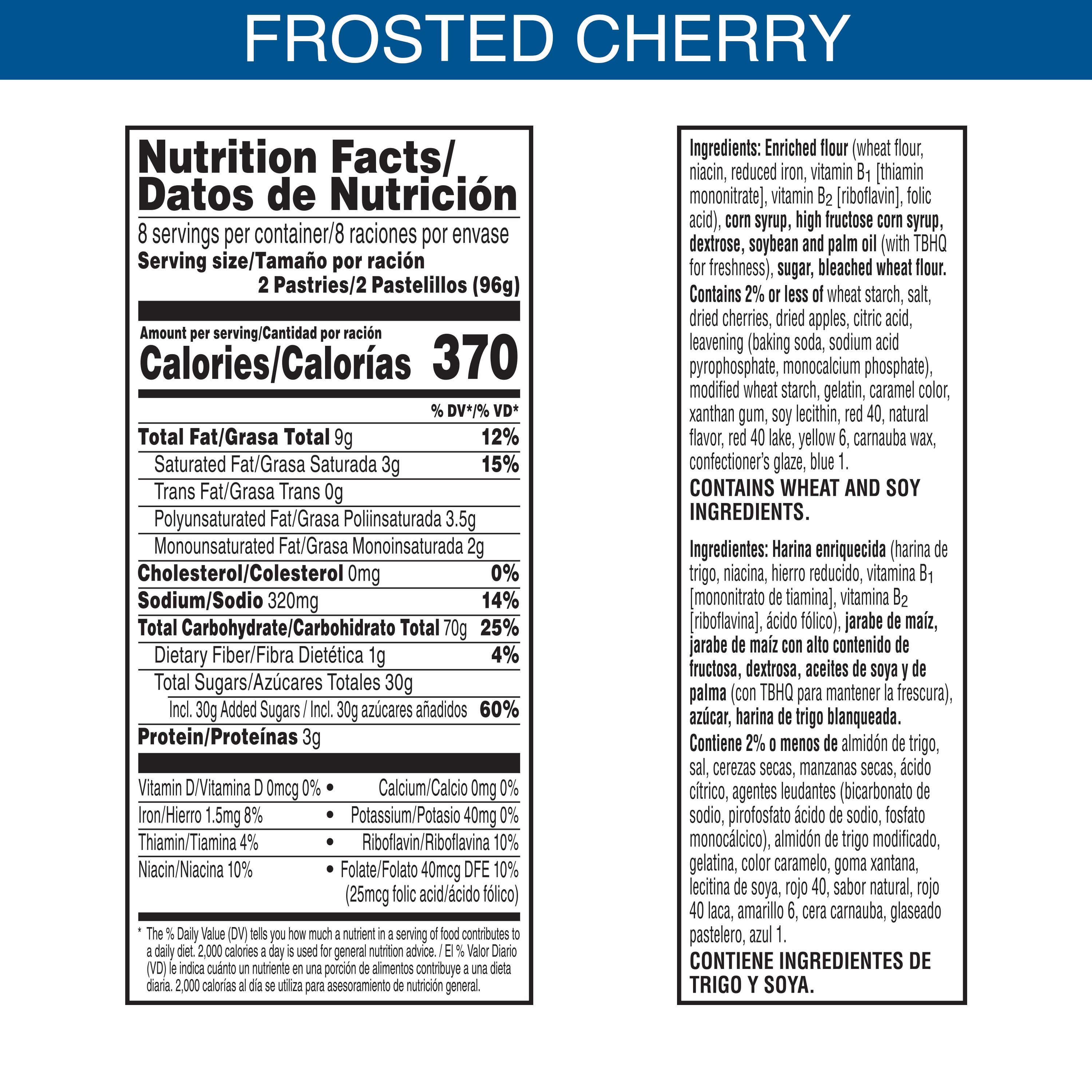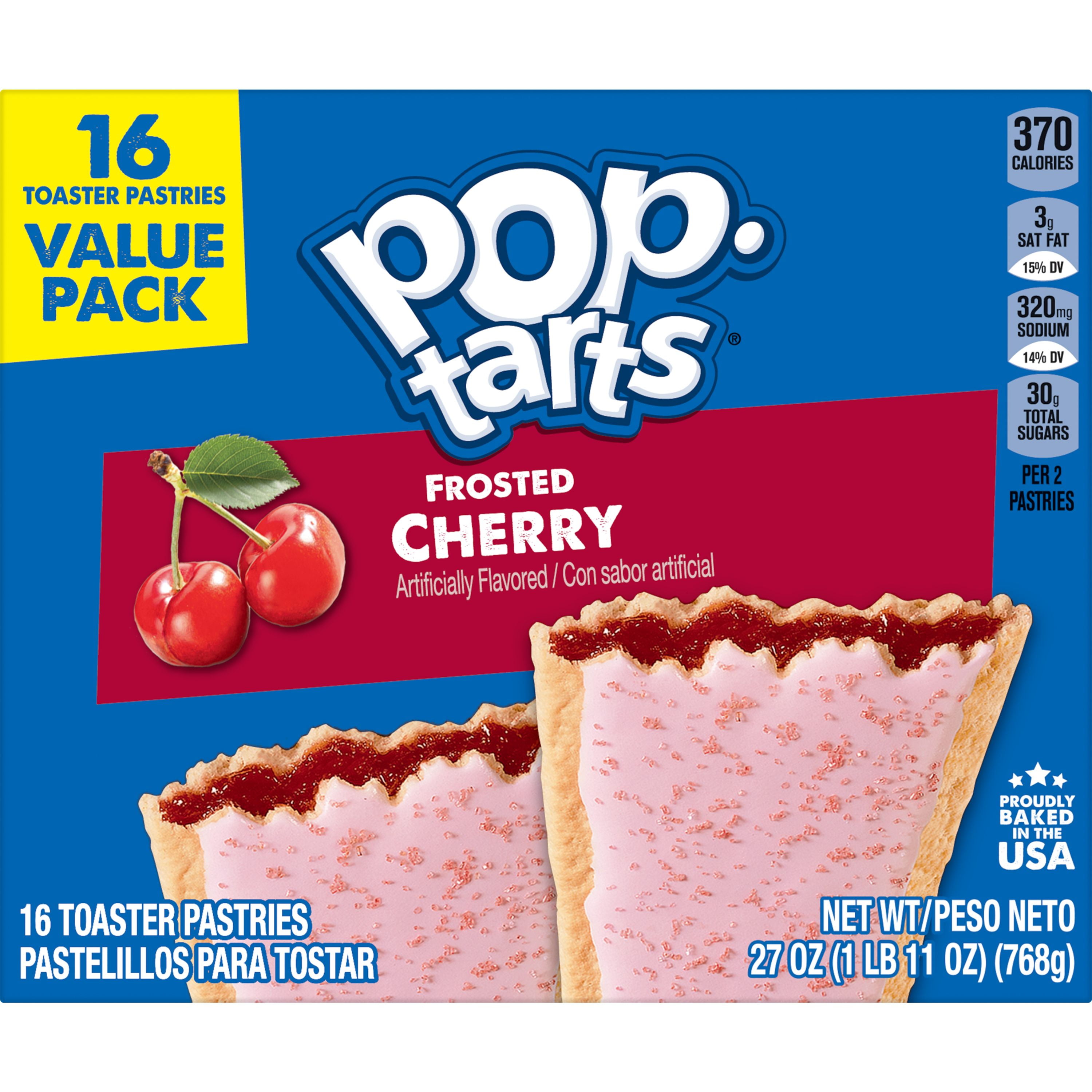 Pop-Tarts Frosted Cherry toaster pastries are a delicious treat to look forward to. Includes one, 27-ounce box containing 16 Frosted Cherry Pop-Tarts. Jump-start your day with a sweet and decadent blast of gooey, cherry-flavored filling encased in a crumbly pastry crust, topped with yummy frosting and crunchy sprinkles. A quick and tasty anytime snack for the whole family, Pop-Tarts toaster pastries are an ideal companion for lunchboxes, after-school snacks, and busy, on-the-go moments; Not just for mornings, the versatile deliciousness of Pop-Tarts fits into your lifestyle just about anywhere there’s time for a snack. Store them in your desk drawer for a pick-me-up at the office, keep them on hand in your pantry for a sweet after-dinner treat, or even bring some in the car for a satisfying snack on the road. These toaster pastries also make welcome additions to care packages, goodie bags, and gift baskets for a pleasant surprise friends and family will be delighted to unwrap. Just pop them in your toaster for a crisp, warm crust, heat them in the microwave, or enjoy them straight out of the foil with a glass of ice-cold milk.