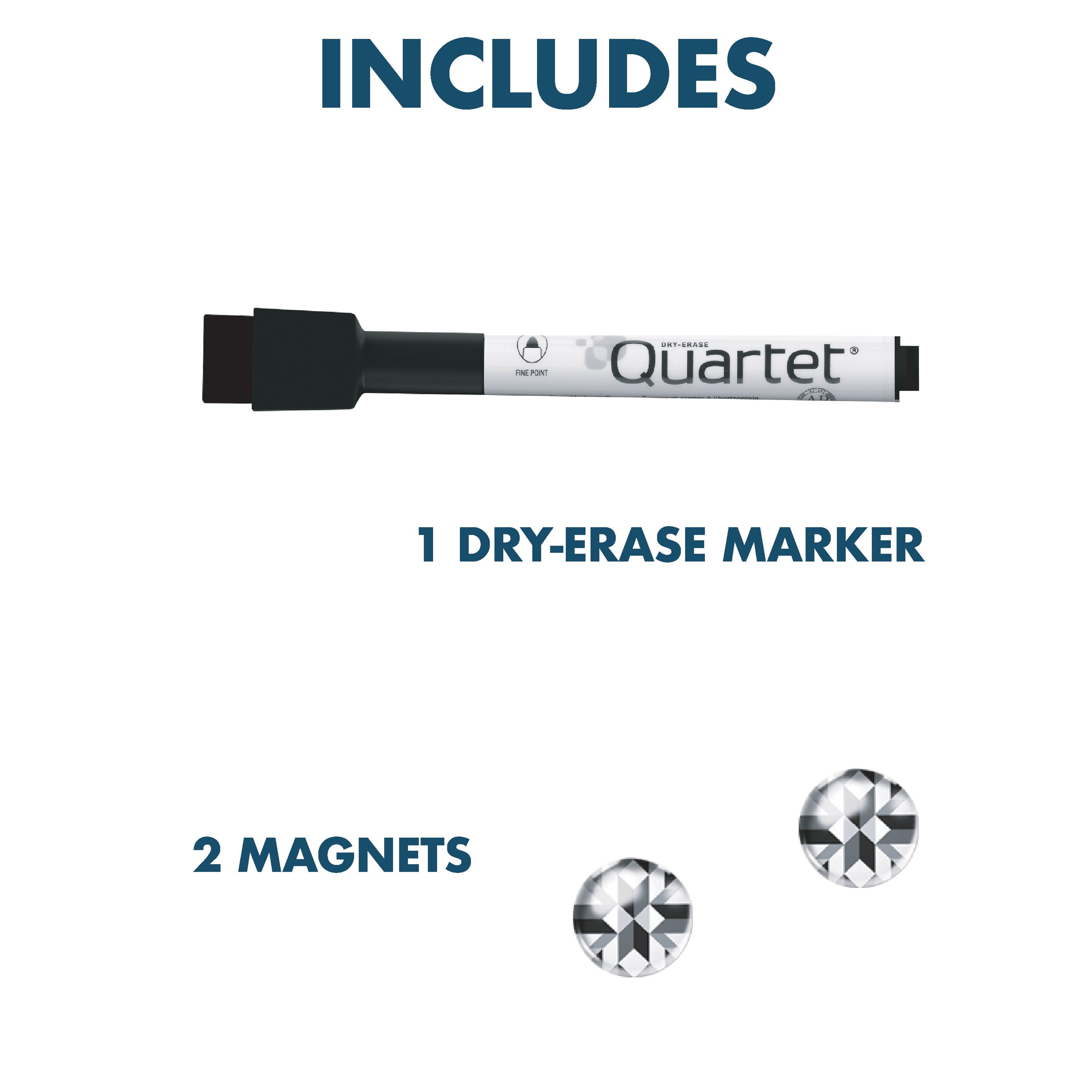 Great for use at home or a personal office space, this Quartet Magnetic Dry-Erase Board allows for both writing and posting of notes. It has a smooth, magnetic surface for easy writing reminders and schedules as well as drawing and sketching with the dry-erase marker, and hang papers, photos, important notes, recipes and more with the two magnets. Quarter dry-erase marker and two magnets are included with the board for your convenience. It comes with self-stick pads for easy mounting on most flat surfaces. Hang vertically or horizontally to fit your space. Its design is so simple and versatile it will fit in an office, home or classroom setting and will match any decor. Painted steel dry-erase board measures 11" x 14". Perfect for light to medium use for office and school projects as well as at home to track kids’ activities, household projects and more. The board has a 60-day manufacturer’s warranty.