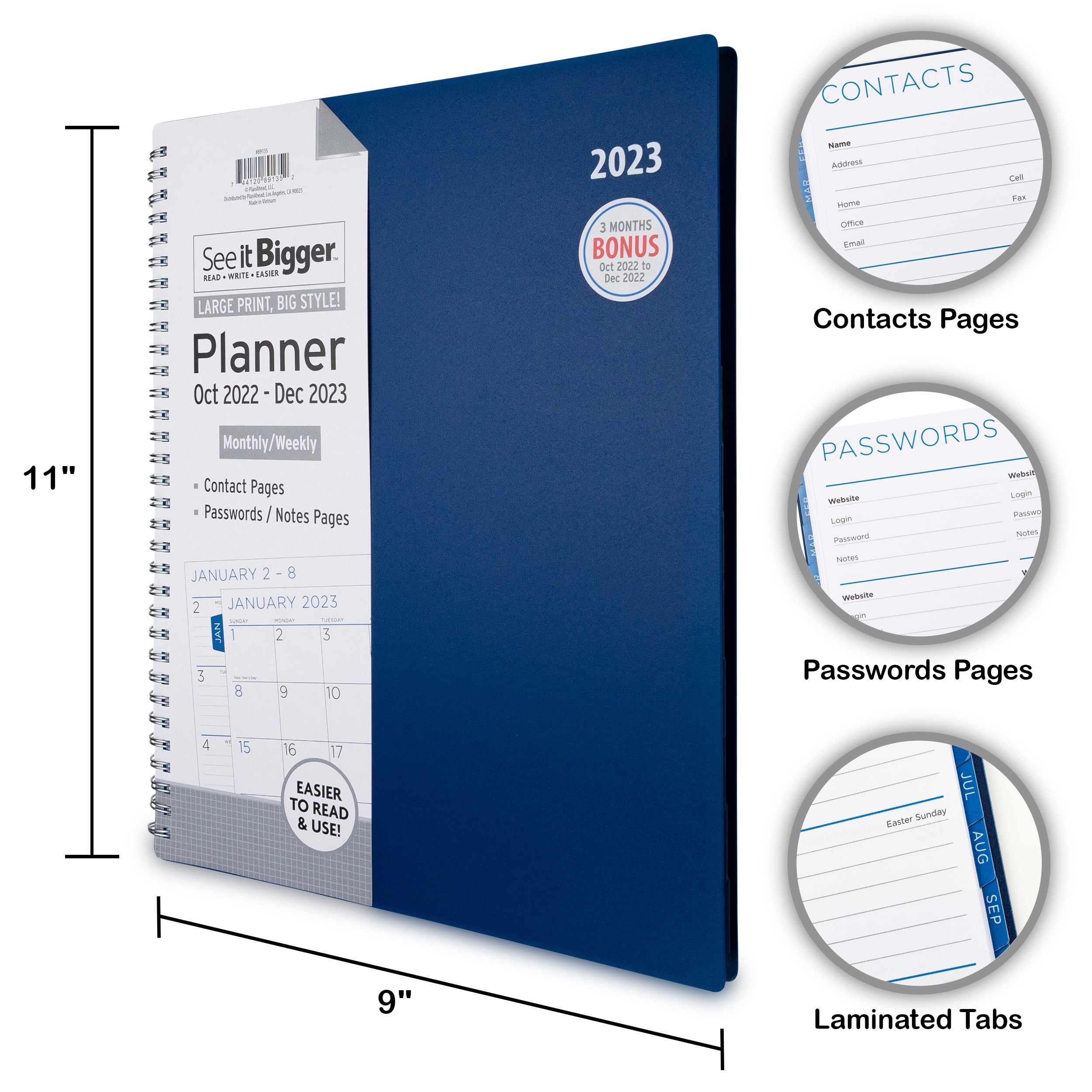 See It Bigger 15-month planner with easy-to-read type has plenty of room to jot down events, notes and tasks. Individual monthly tabs allow for quick access to separate monthly calendars that open flat in side-by-side pages for simple retrieval. A defined space along the right margin provides room for notes and tasks. Each monthly tab includes dated weekly pages that open, so each week may be viewed in its entirety. Yearly reference calendars and holiday Listings make future planning simple.
