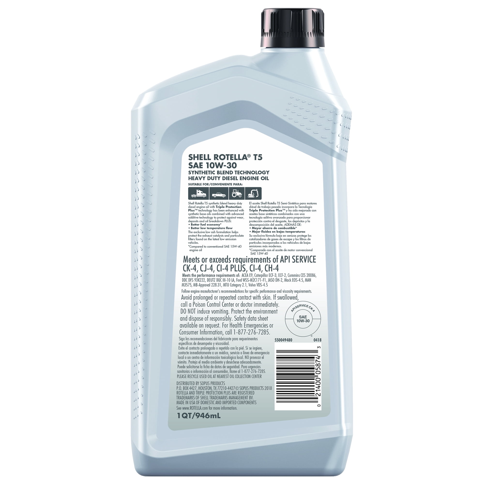 - Shell Rotella T5 10W-30 Synthetic Blend Heavy Duty Diesel Oil delivers an average of 44% better than the maximum wear requirements and provides hard-working protection that adapts to your driving conditions
