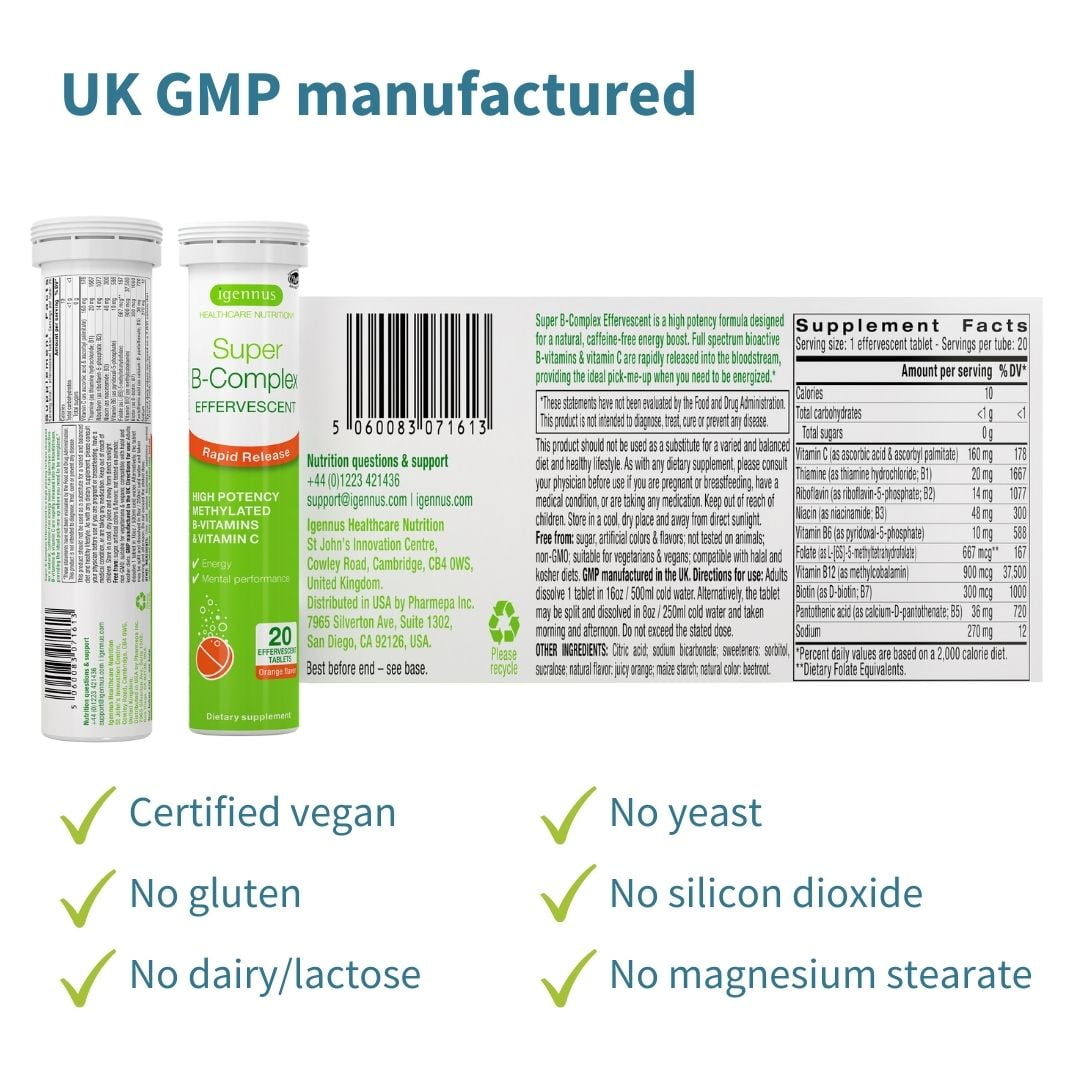 Super B-Complex Effervescent is a high potency formula designed for a natural, caffeine-free energy boost. Full-spectrum bioative B-vitamins & vitamin C are rapidly released into the bloodstream, providing the ideal pick-me-up when you need to be energized mentally or physically. This supplement provides full-spectrum B-vitamins in bioavailable methylated forms that the body absorbs and utilises easily. Each ingredient has been selected for optimum absorption and biological activity, including folate (as methyltetrahydrofolate), methylcobalamin and pyridoxal-5-phosphate. The B-vitamins included in this formula are scientifically shown to support energy production, reduce tiredness and fatigue, and boost mental performance.