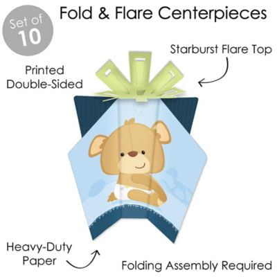 - Baby Boy Teddy Bear Fold and Flare Centerpieces INCLUDE: 10 heavy-duty paper centerpieces in our Baby Boy Teddy Bear theme. Each centerpiece has art on all four sides and starburst top for an impressive display. Some simple folding assembly required.