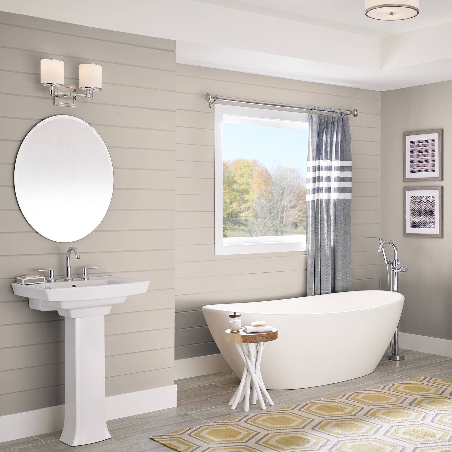 KILZ complete coat Paint & Primer in One Interior/Exterior is a low VOC, low odor 100 percent acrylic house paint that has the best features of interior and exterior paint in one convenient product. KILZ offers excellent hide, easy application and touch up, and resistance to staining, fading and peeling. It is also highly washable and has a mildew-resistant finish. Available in 736 colors and three sheens; Flat, Satin and Semi-Gloss. Color samples are available in 8 oz. containers. INTERIOR USES; Walls, ceilings and EXTERIOR USES; Siding, shutters, fencing. SURFACES to be used on Drywall, stucco, brick, masonry, wood, fiber cement, vinyl siding. Do not use on floors. COVERAGE: 300-350 square feet per gallon on smooth surfaces; 200-300 square feet per gallon on rough surfaces.
