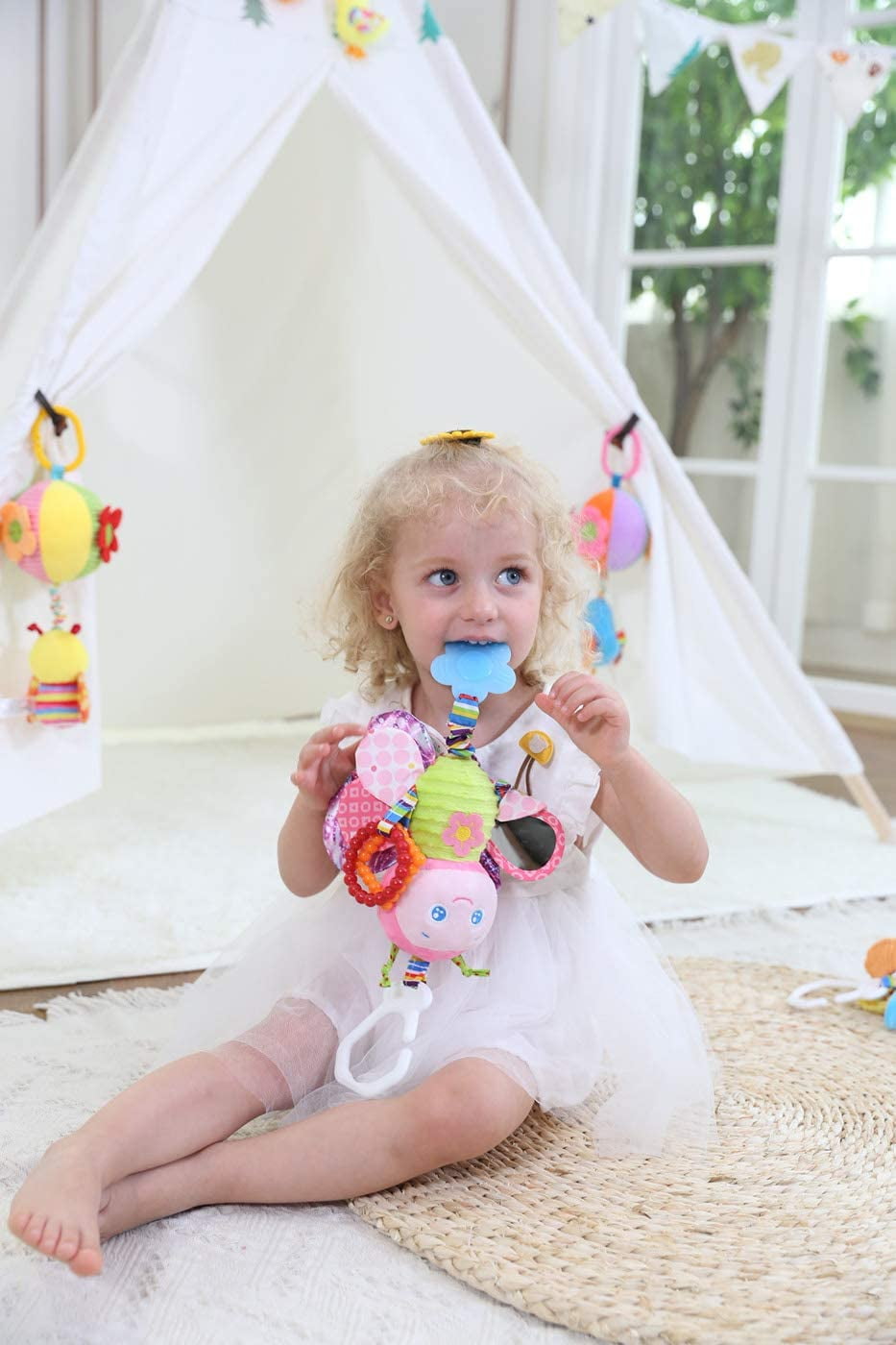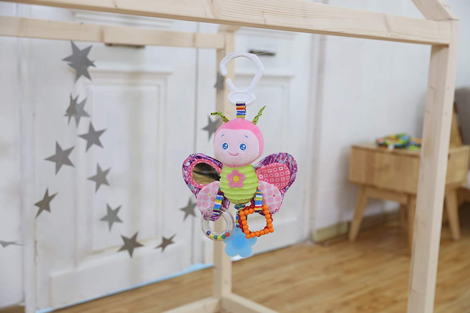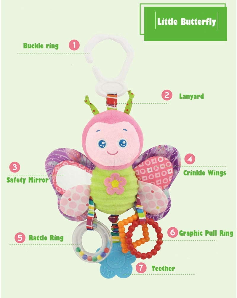 This cute little butterfly toy is equipped with teether leaves, fold wings, safety mirror, belly sound, rattle ring And easy to hang.