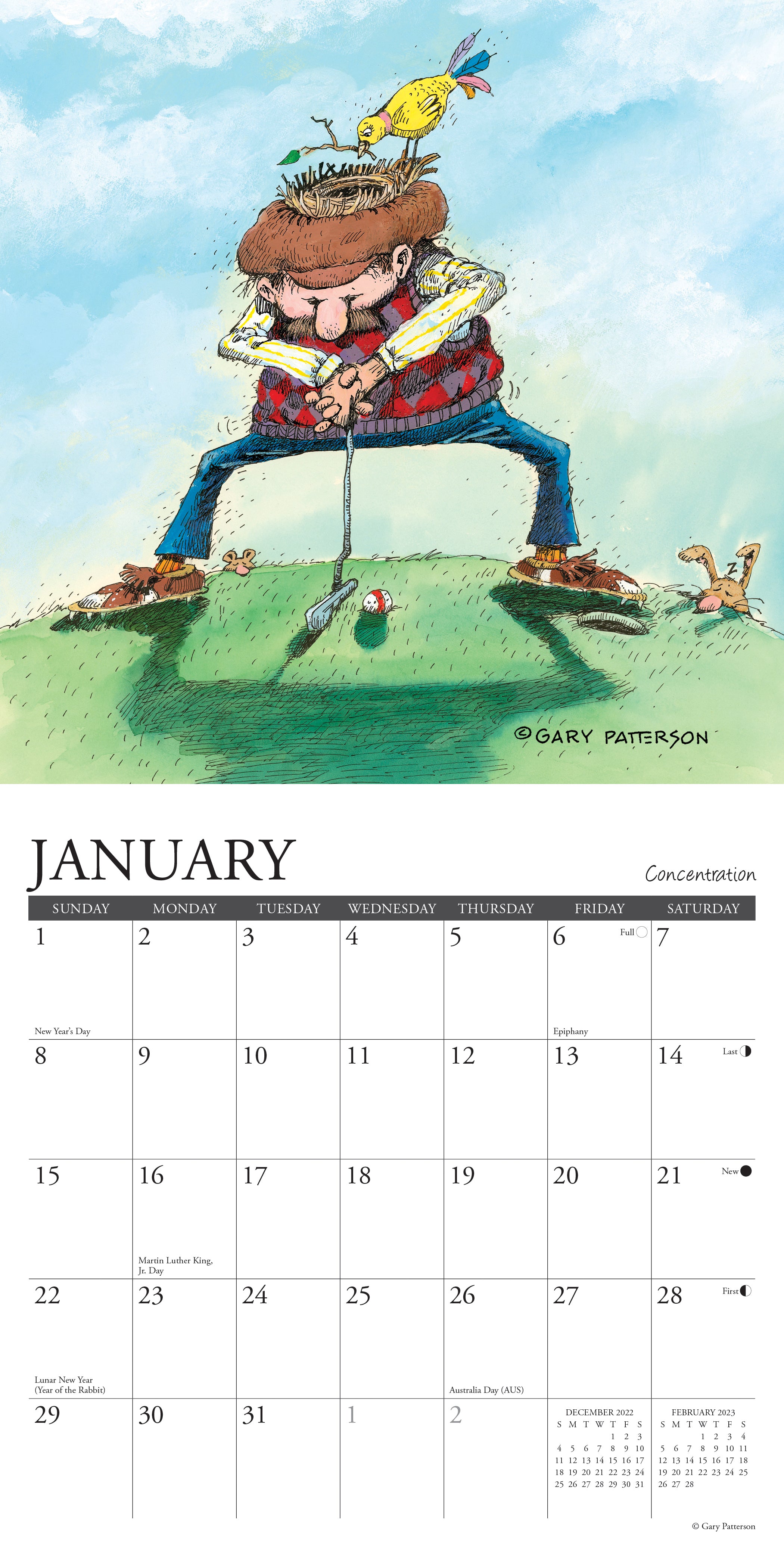 In Golf Crazy, well-loved artist Gary Patterson brings to life all the triumphs and frustrations of weekend warriors with his endearingly funny illustrations about the game of golf and those who play it. You’ll rate this hysterical collection way above par — and score a hole in one with golfer friends who receive it as a gift. Printed with soy-based inks on FSC certified paper, this 7”x 7” wall calendar features large monthly grids that offer ample room for jotting notes, along with six bonus months of July through December of 2022. Also includes moon phases (CST), standard U.S., and international holidays.