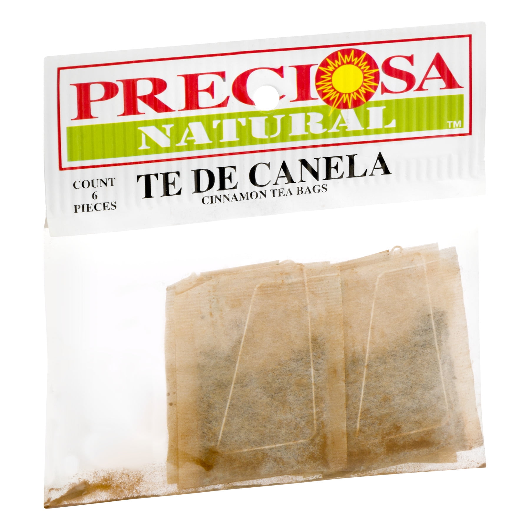 Preciosa Canela (Cinnamon) Tea Bags are packed with 6 individual tea bags in a clear Cellophane bag