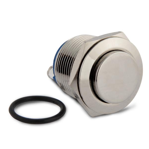 Order new momentary pushbutton switch. This round chrome switch has a finish made from brass and nickel metals. (1) Metal push button momentary reset switch. Bolt-on design. Switch type: Reset. Size: 28.2 x 22 x 22 mm. Rating: Up to 5A/3V-250V. Material: Brass nickel plated. Finish: Chrome / Silver.