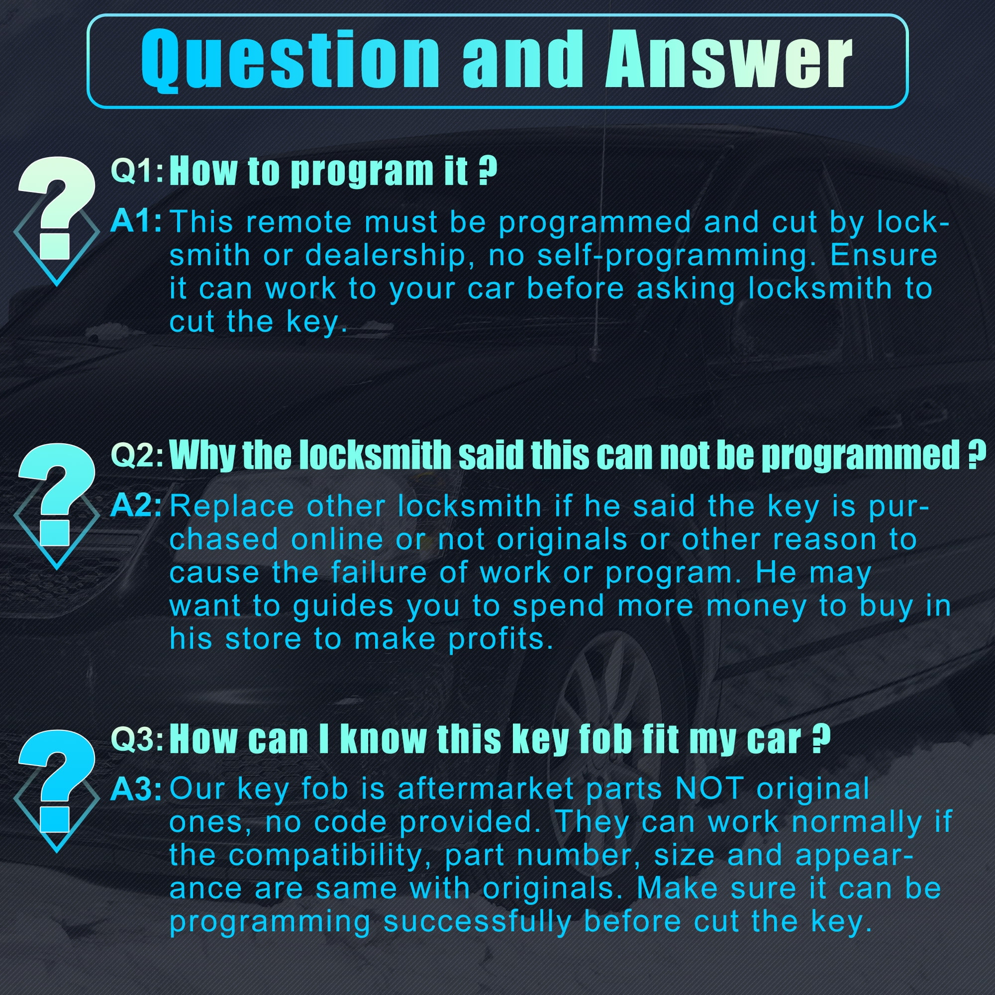 Fitment: for Chevrolet Colorado 2004-2012, for Chevrolet Venture 2001-2005, for GMC Canyon 2004-2012, for Hummer H3 2006-2010, for Hummer H3T 2009-2010, for Isuzu i-280 2006, for Isuzu i-290 2007-2008, for Isuzu i-350 2006, for Isuzu i-370 2007-2008, for Oldsmobile Silhouette 2001-2004, for Pontiac Montana 2001-2005(base model). This is a non-OEM product, accessory only! Programming: This remote must be programmed and cut by a qualified locksmith or dealership. Note: 1. Please make sure the remote programming can work to your vehicle before asking locksmith to cut the key. Don’t wait for him to cut the key and discover that it does not work, which may make a loss. 2. If the locksmith declares that the key is purchased online or is not an original part, or other reasons to cause it can’t work normally, and guides you to spend more money to buy in his store, maybe he wants to make more profits. We suggest you replace other locksmiths to program. Package Included: 1 x Car Keyless Entry Remote (Battery included).This remote must be programmed and cut by a qualified locksmith or dealership(Need to pay extra money for programming or cutting)