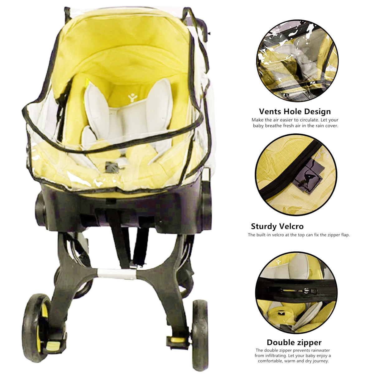 With Zipper and Vents:The waterproof stroller cover zipper stops rain from seeping in, and there are air holes on both sides of the rain cover, making the air easier to circulate. This design can effectively reduce the difficulty of breathing in the stroller in the sultry weather.