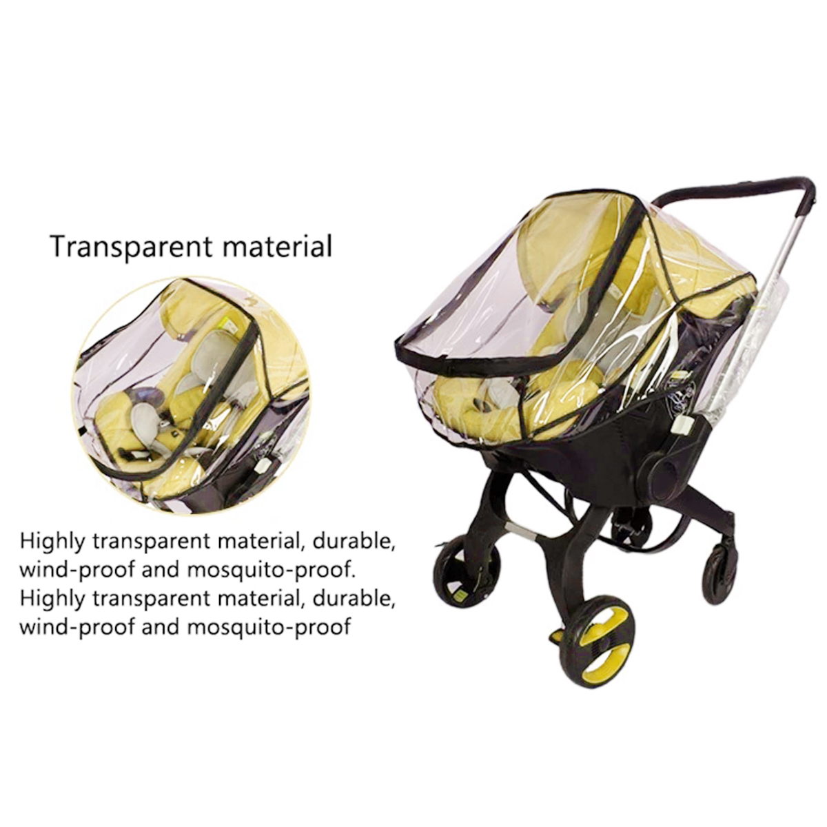 - Transparent Window:The high definition and the transparent protective window do not block view vision. Both baby and parent can see each other. The transparent stroller raincoat shows the babies’ real-time baby’s current situation for the parent, effectively reducing accidents happened.