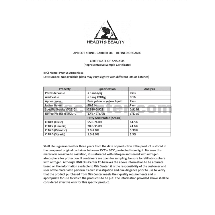 Shelf Life: Apricot Oil is slow to go rancid; users can expect a shelf life of 1 Year with proper storage conditions (cool, out of direct sunlight). Refrigeration after opening is recommended.