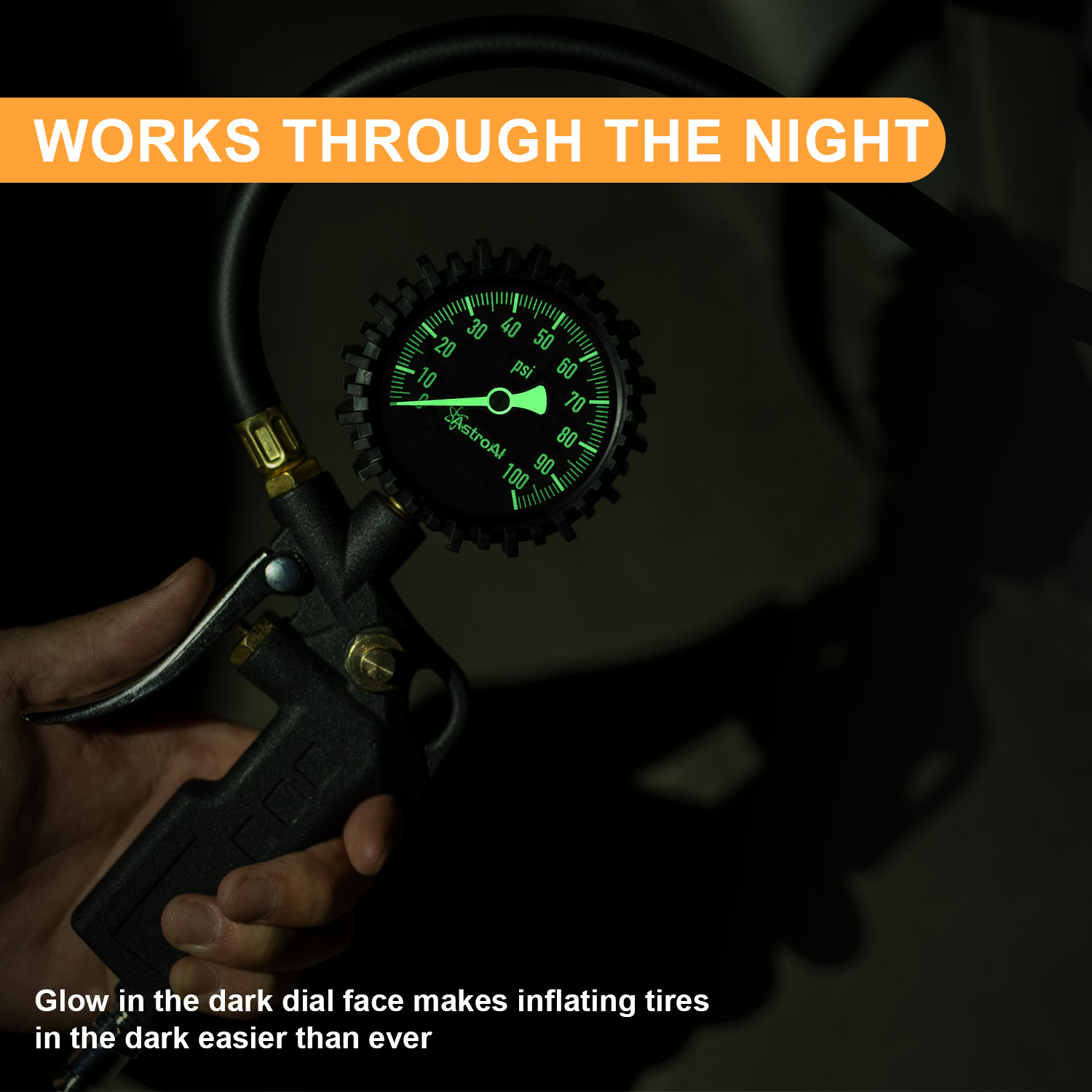 AstroAI Portable Tire Inflator with Pressure Gauge, 100 PSI Air Chuck and Compressor Accessories Heavy Duty with Large 2.5" Easy Read Glow Dial, Durable Rubber Hose and Quick Connect Coupler The Digital Tire Inflator Gauge makes filling tires extremely easy when using an air compressor. Instead of filling a tire by checking the pressure, adjusting, and repeating over and over again, simply press the handle of the tire inflator gauge down to fill the tire to the exact pressure you want and then release the handle, it will stop filling. Save your time by filling the tire only once. 3-in-1 Mechanical Tire Inflator Gauge Range: 0-100 PSI Large 2.5" Glow Dial No Battery Required Attention! Do not exceed the maximum pressure of the gauge, doing so will permanently damage the device