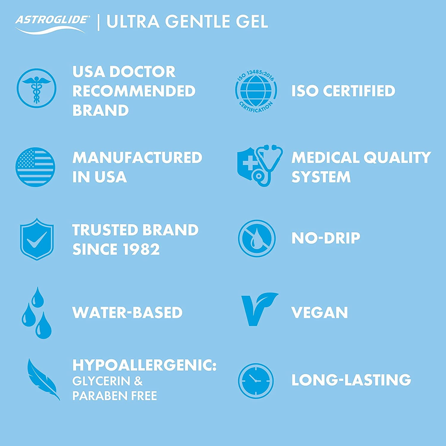 Astroglide Ultra Gentle Personal Lubricant Gel, 3 oz. Reduces friction, discomfort, dryness, and irritation, especially for those with sensitivities.This water-based lubricant gel is made without glycerin, parabens, fragrances, or alcohol. This lubricating gel is also made with the finest ingredients in the industry. Providing the same silky smooth lubrication for your skin as other Astroglide lubes, our thicker and ultra gentle water-based lube formula soothes and is hypoallergenic. It makes a difference in lubricating throughout playtime. Pack of 2