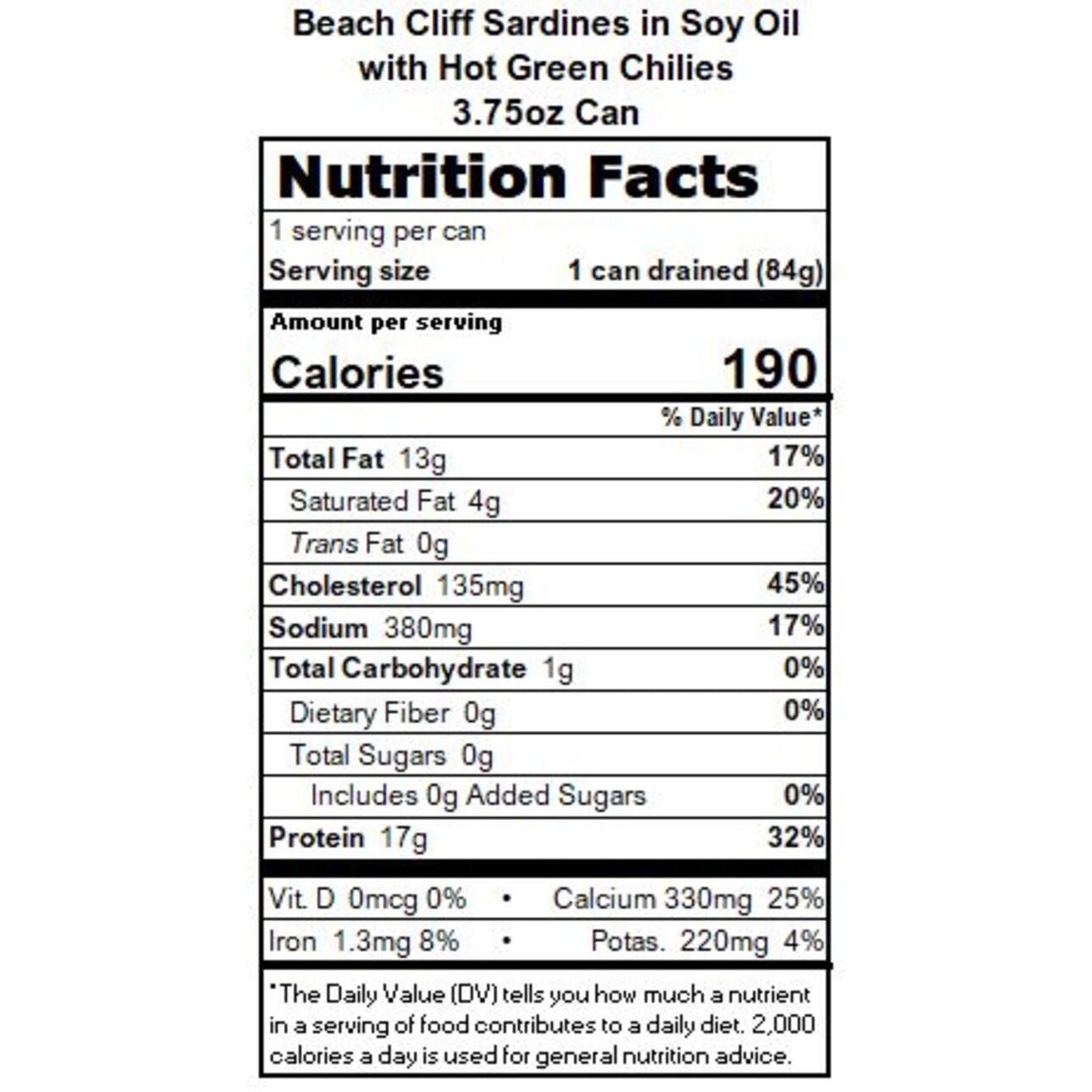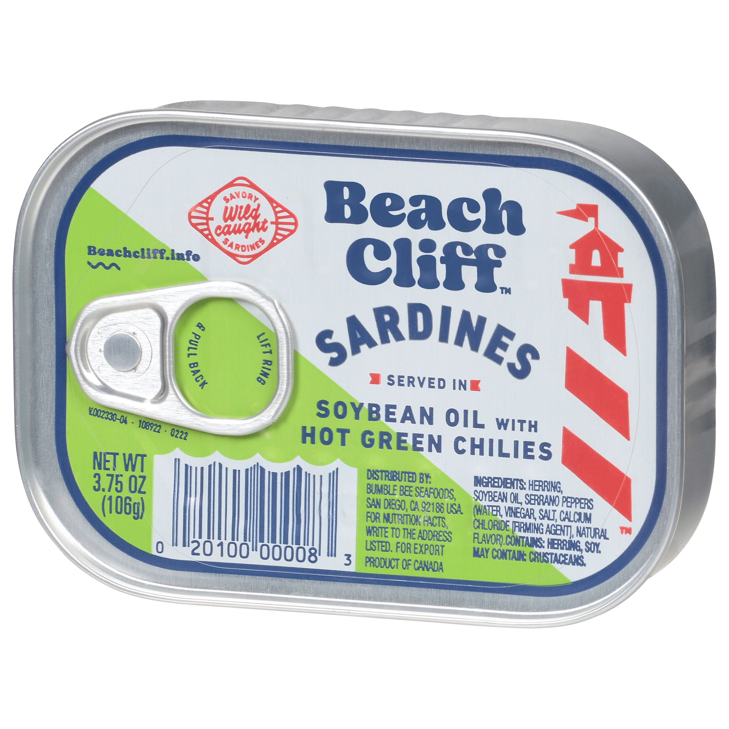 Beach Cliff Sardines in Soybean Oil with Hot Green Chilies, 3.75 oz Can