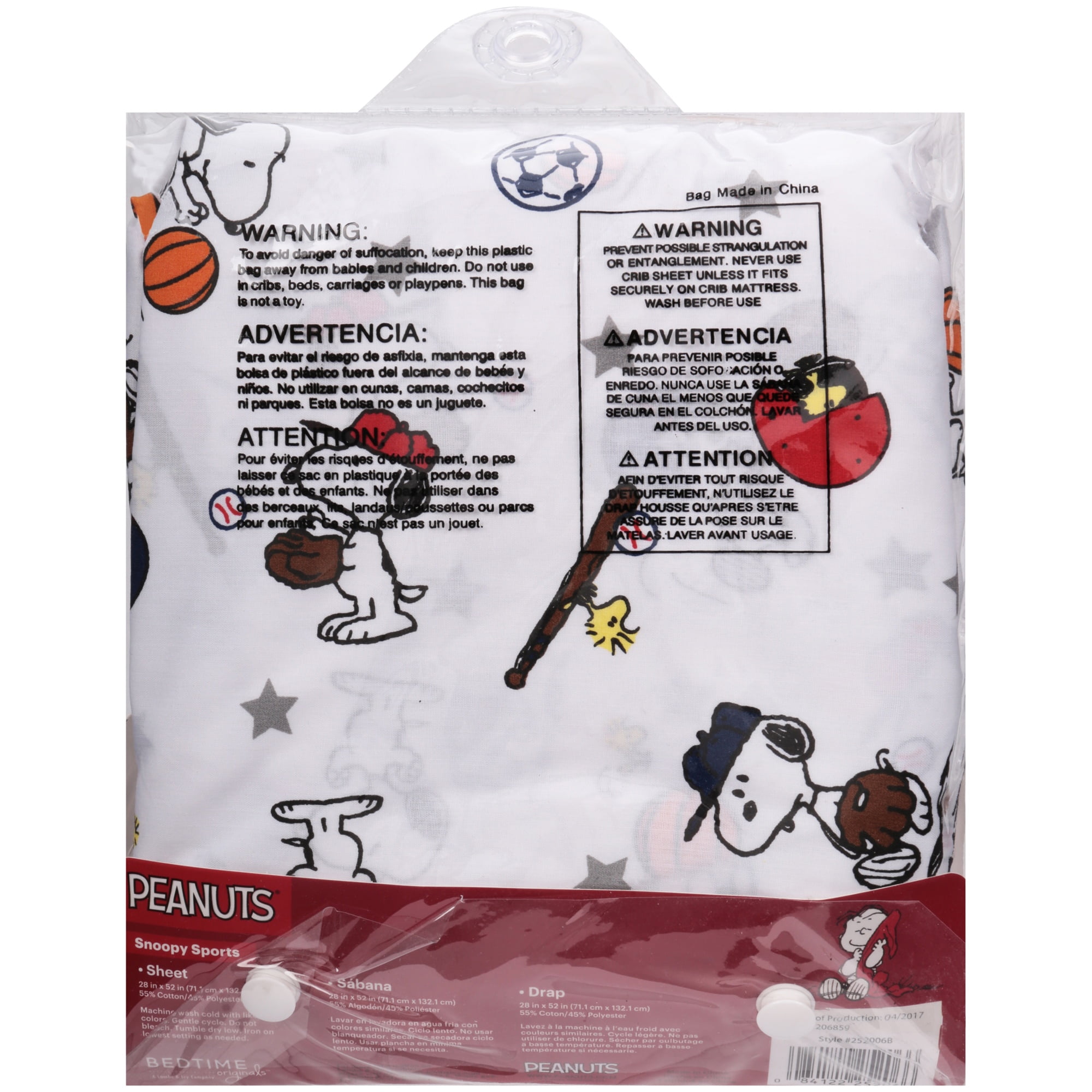 Decorate your toddler’s crib and bedroom with this cute and fun Snoopy Sports Accessory Set from Bedtime Originals. Adult and children alike will enjoy this piece of official Peanuts merchandise. This accessory set includes 1 sheet (28" x 52") that is made from 55% cotton and 45% polyester, and features Snoopy playing baseball, basketball, and soccer. Practical for you, and fun for your child, this sheet will make you and your baby’s life more comfortable, while your home’s nursery will look better than ever.