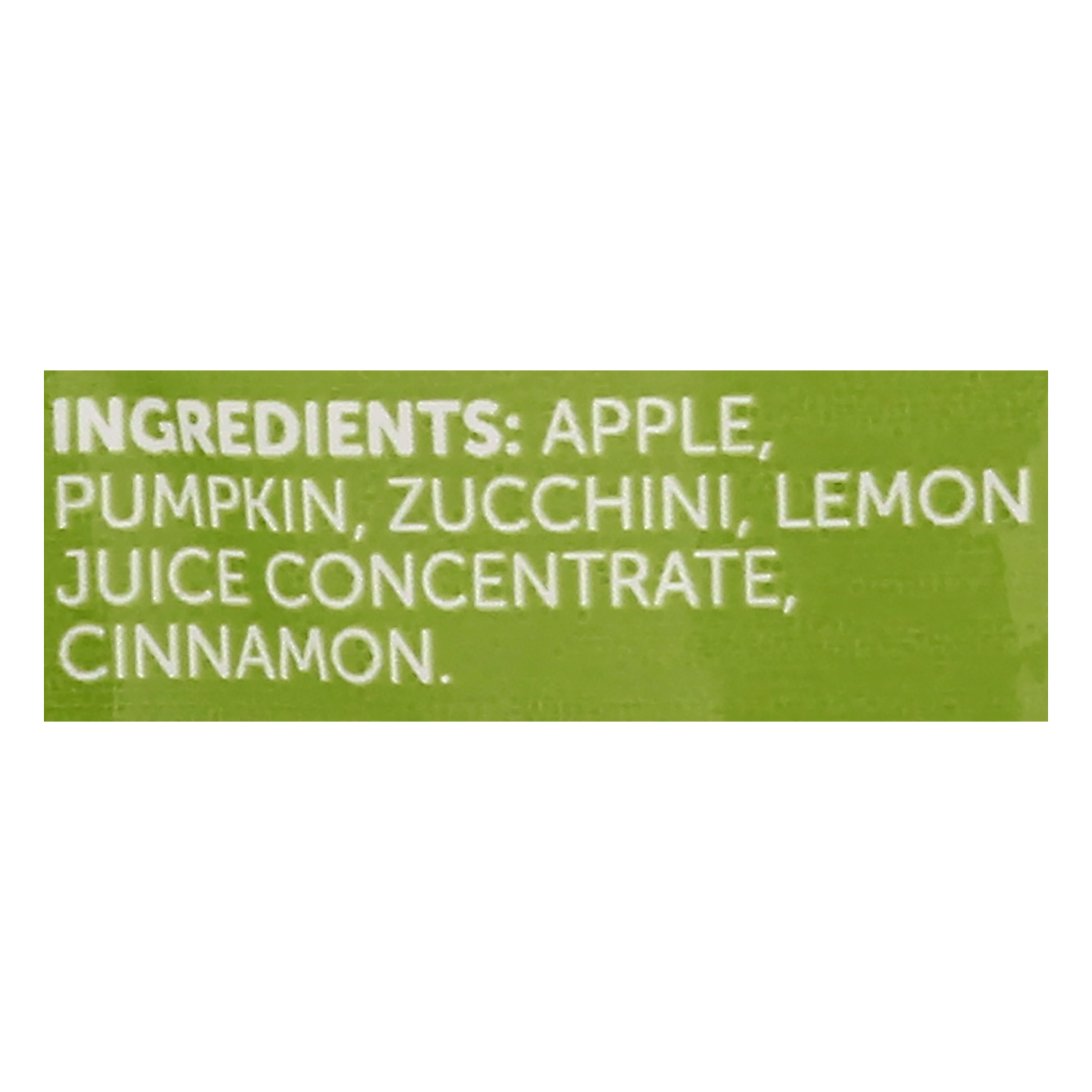 - Ingredients: Apple, pumpkin, zucchini, lemon juice concentrate, cinnamon