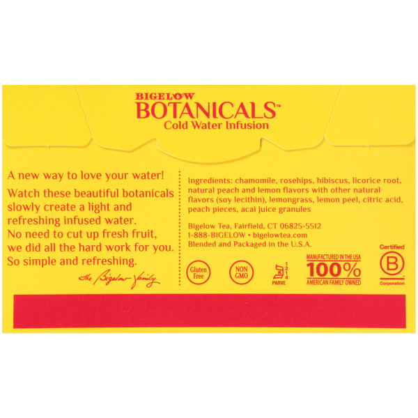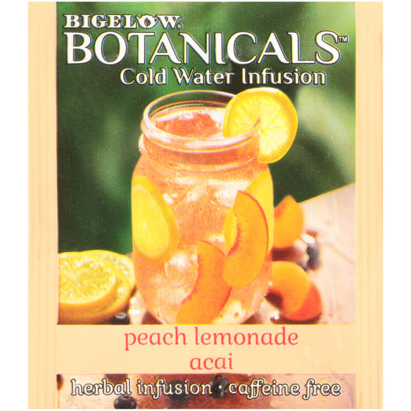 Bigelow Botanicals Cold Water Infusion Tea Bags, Peach Lemonade Acai, 18 ct box. Create your own botanical infused water with Bigelow Botanicals Cold Water Infusion. No need to cut up fresh fruit, we did all the hard work for you. Simply infuse tea bag in cold water to create a light and refreshing taste. Peach Lemonade Acai flavor combines slightly tart lemon flavor and a hint of sweet peach. Each bag is individually wrapped for your added convenience to have by the glass or on-the-go. This caffeine-free herbal infusion is a new way to love your water. 18 count tea bags, zero calories, no artificial anything. Drinking more water just got easier.