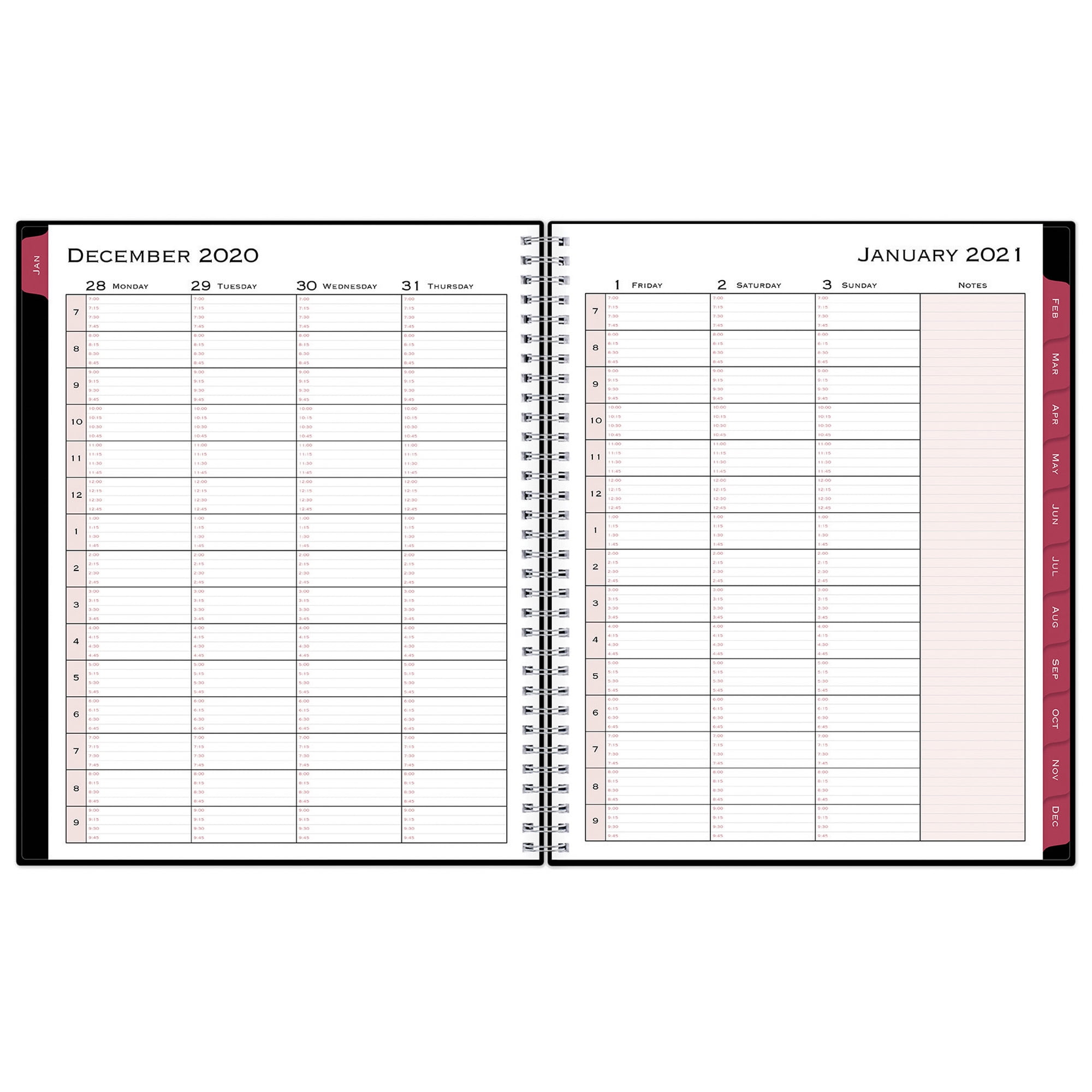 Appointment planner features a classic design to give you the professional exterior you’re looking for along with the interior content you rely on to manage your everyday scheduling. Time slots in 15-minute increments on the weekly calendar pages over a two-page spread help you efficiently manage and track appointments. Use the open notes column for reminders and navigate your month with the two-page monthly view spread. Coated monthly calendar tabs help you quickly find your appointments and stay on track throughout the year. Thick, premium-quality pages reduce ink bleed-through to ensure your writing stays legible on every page. Double-wire binding allows pages to turn smoothly and keeps your planner flat on surfaces for easier writing. Planner includes a yearly goals page, contacts, important dates, notes pages and four years of holidays.