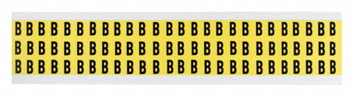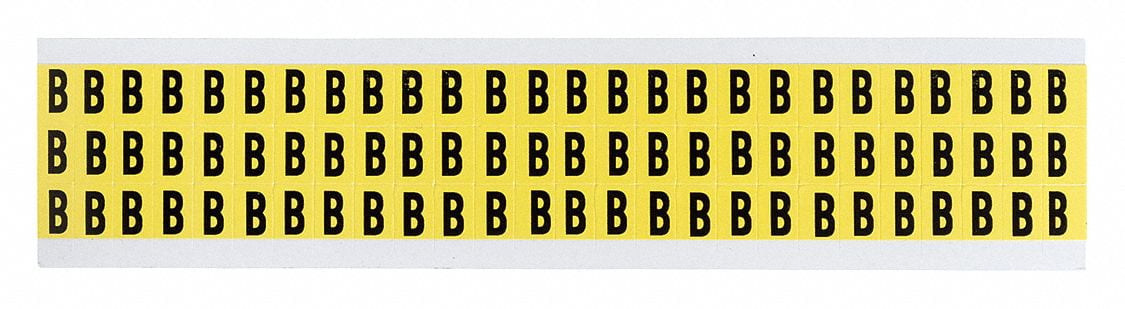 Letter Label, Character B, Character Height 3/8 in, Overall Height 1/2 in, Overall Width 11/32 in, Character Type Letters, Material Vinyl, Background Color Yellow, Retroreflective Grade Not Retroreflective, Glow-in-the-Dark No, Markers per Card 78, Number of Cards 1, Character Width 1/4 in, Standards ASTM B 117; ASTM D 1000; ASTM D 2979; ASTM G 155; UL Recognized, Character Color Black, Package Type Sheet, Die Cut Yes WARNING: Cancer and Reproductive Harm – www.P65Warnings.ca.gov -Brady Letter Label,B,1/2in.Hx11/32in.W,Vinyl 3410-B