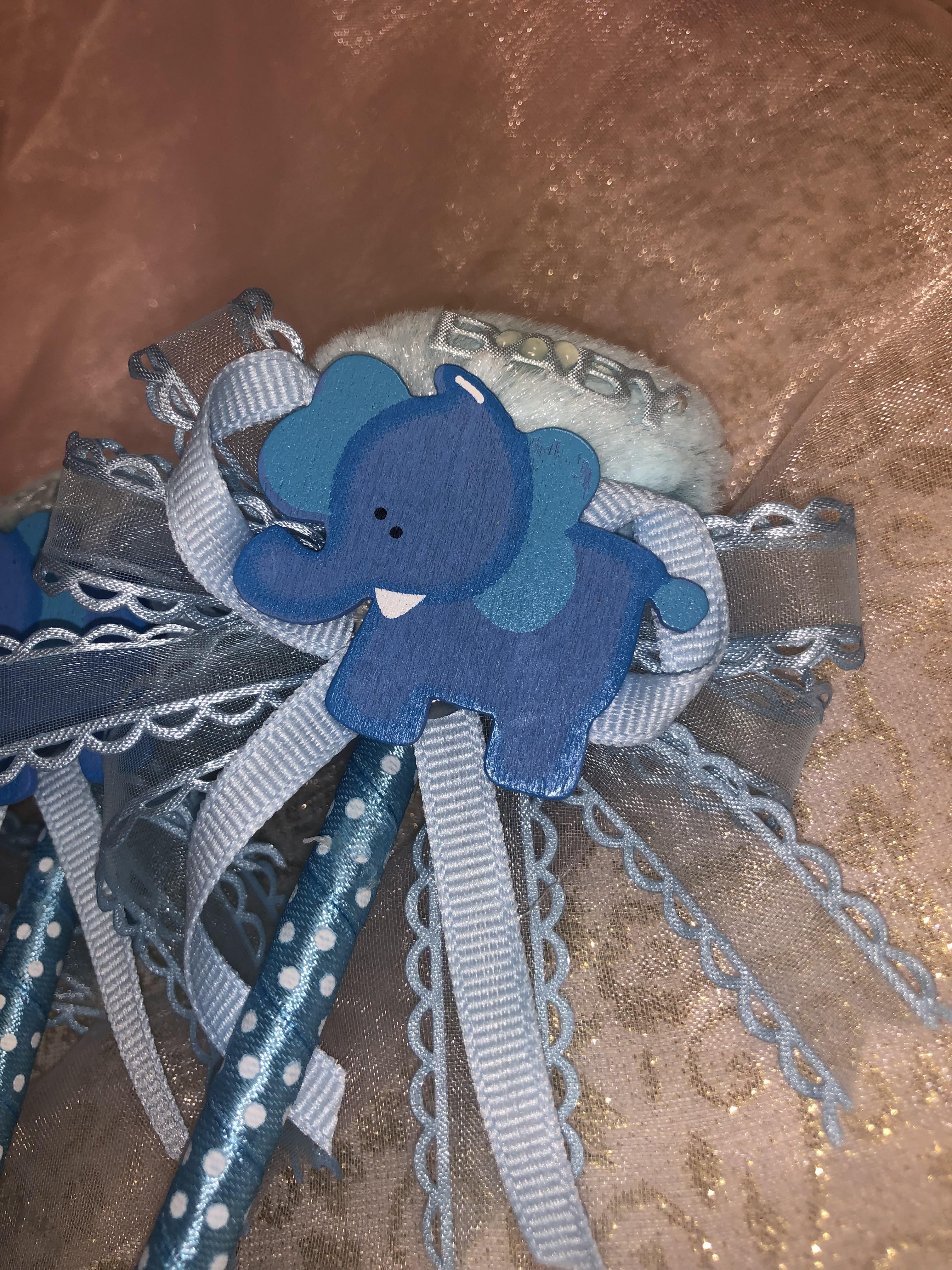 Charmed adorable blue elephant pen baby shower favors. 2" PomPom Pens with poke dots ribbon. Decorated with Ribbon and cute little elephant; Size: 7.5" long pen; Blue "It’s a Boy"