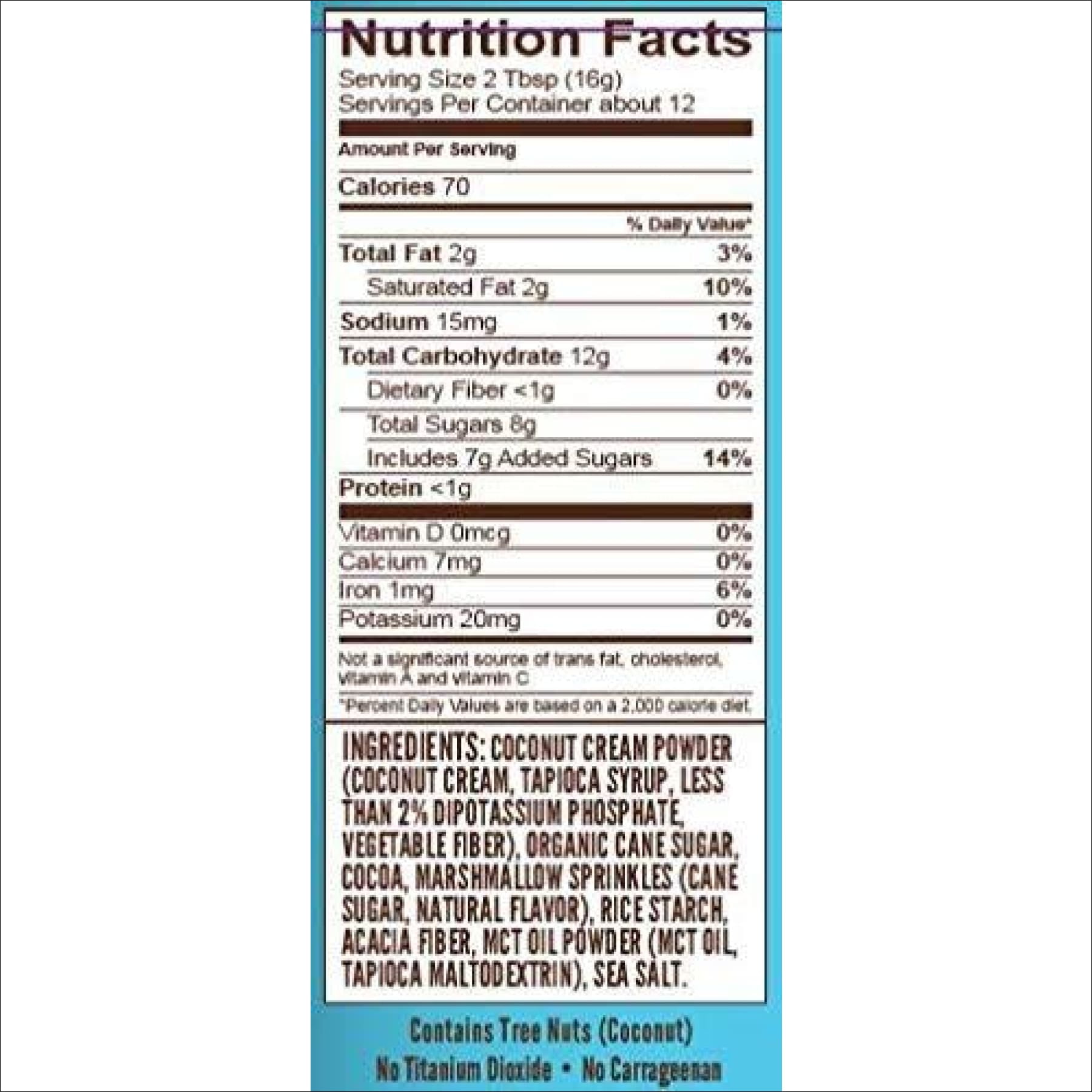 • Coconut Cloud Toasted Marshmallow hot cocoa mix is dairy free, vegan, Non GMO, and also gluten free.