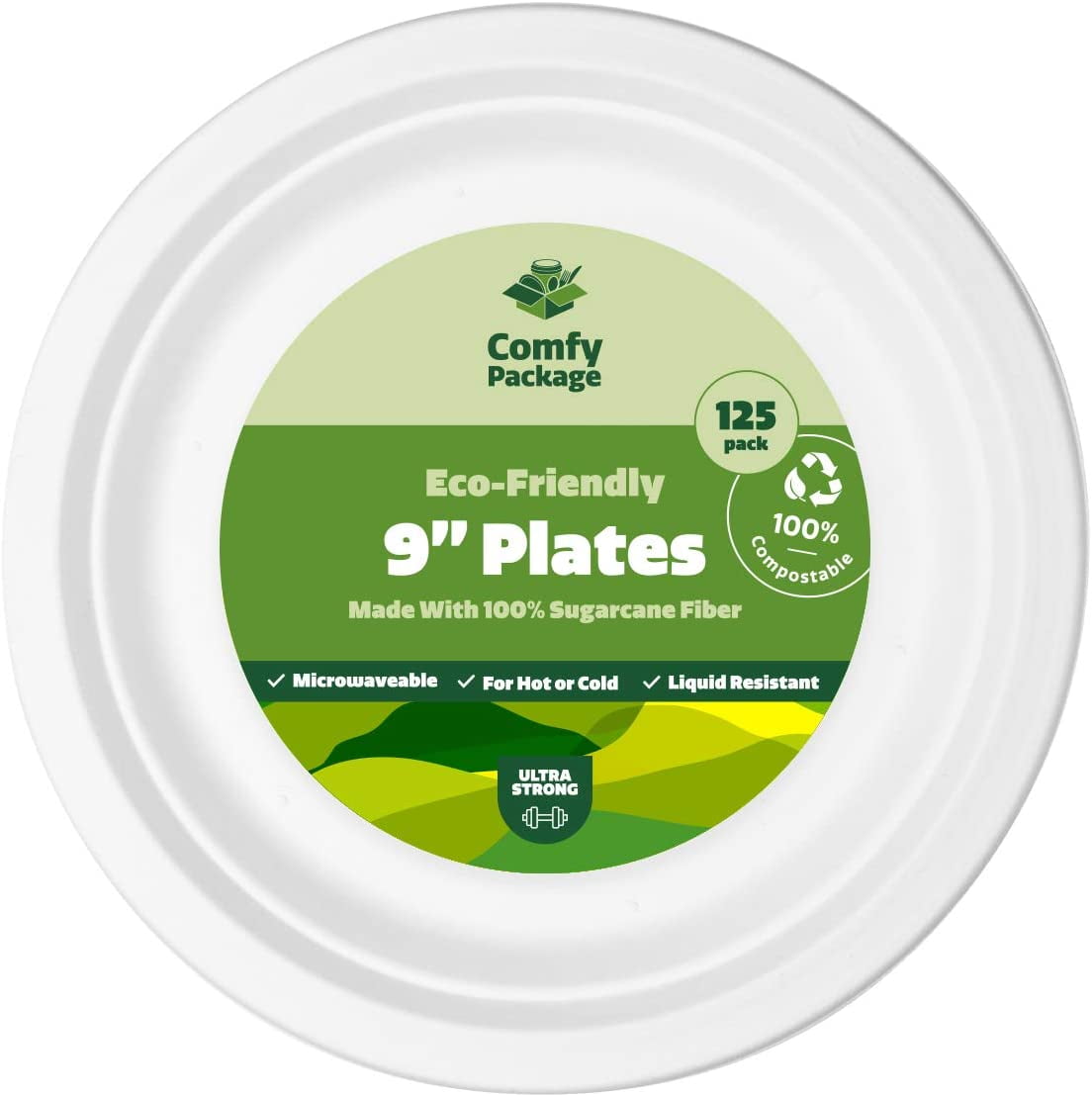 - This Comfy Package [125 Pack] 9 inch eco-friendly heavy-duty paper-like disposable plates is perfect for serving hot or cold with space for a main and 2 sides.