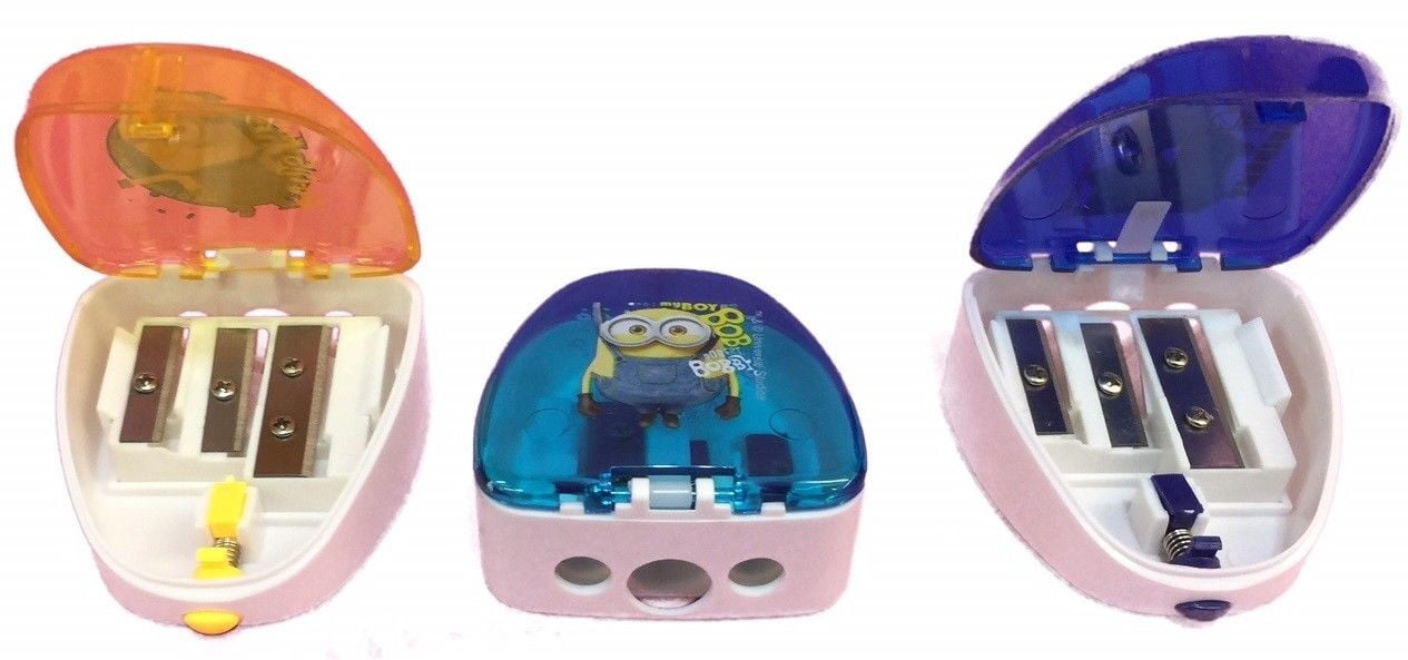 licensed fits 3 sizes of pencil thicknesses measures approx. 2" X 2" made of plastic top cover can be opened to empty pencil shavings. Despicable Me Minions Set of 3 Pencil Sharpeners- Yellow, Teal, Blue