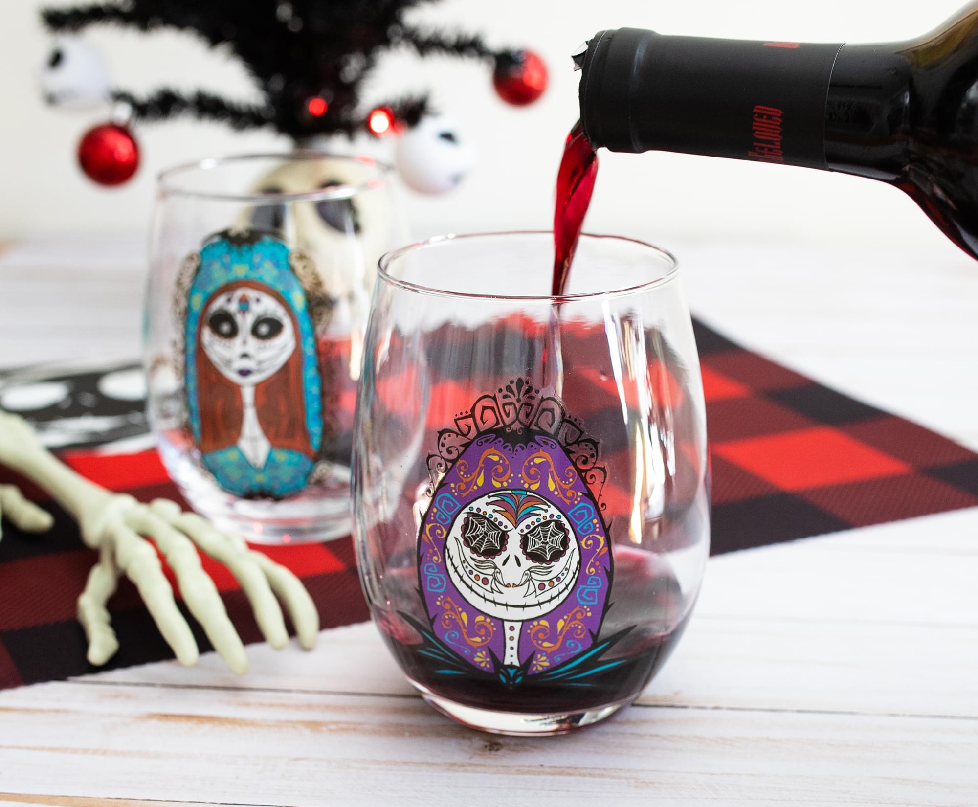 - Festive Design: These stemless wine glasses reimagine Tim Burton’s The Nightmare Before Christmas with a new holiday mashup. Features Jack Skellington and Sally with a Day of the Dead makeup design.