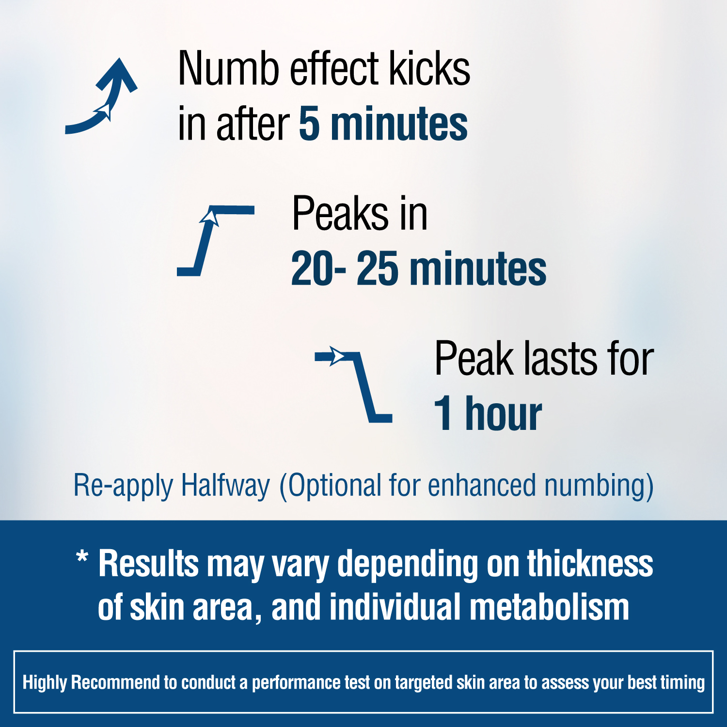 - FAST WORKING & LONG LASTING: take only 20-25 minutes to reach max numbing level, last for 1-2 hours. Paraben-free, cruelty-free, oil-free, never tested on animals, no harmful chemicals, no additives.