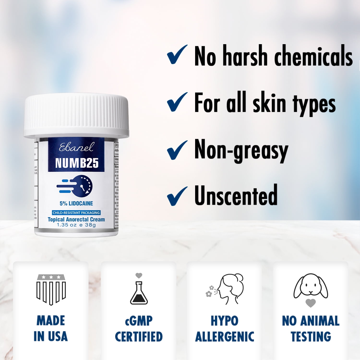 You don’t have to endure the pain. Ebanel Numb25 5% Lidocaine Numbing Cream fast relieves pain for your skin treatment and health care needs. This OTC (over-the-counter) lidocaine cream pain relief drug is specially formulated with maximum strength lidocaine and enhanced penetration for the best results. Recommended use for minor cuts, minor scrapes, minor burns, insect bites, anorectal disorders. Safe and great for all skin types. Formulated and bottled in an FDA-registered facility in California, USA.