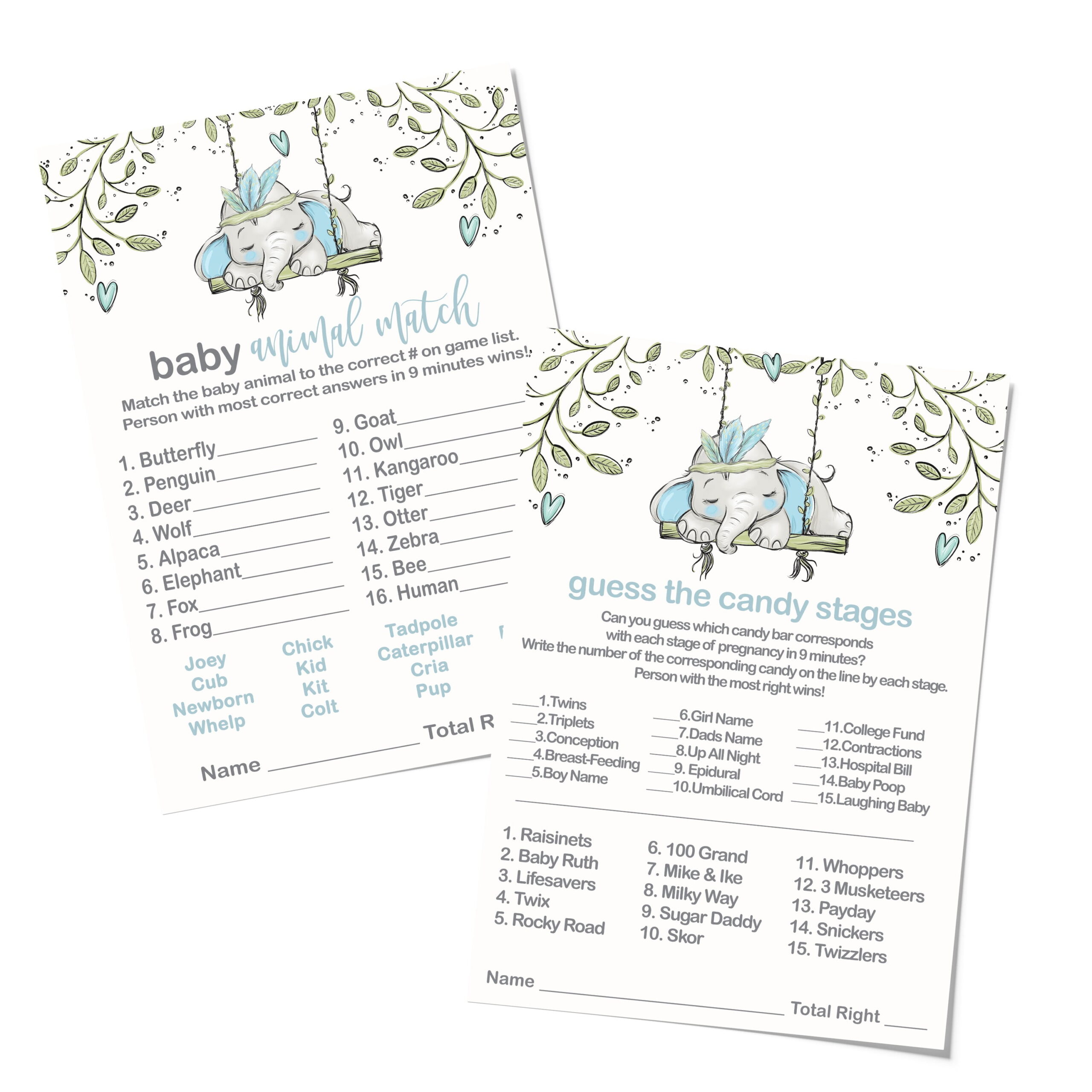 Elephant Baby Shower Game Bundle (25 Guests) Set Includes Baby Animal Matching Game – Candies Guessing Activity Cards – Boys Blue Safari and Greenery Theme (5×7 Inches) Paper Clever Party