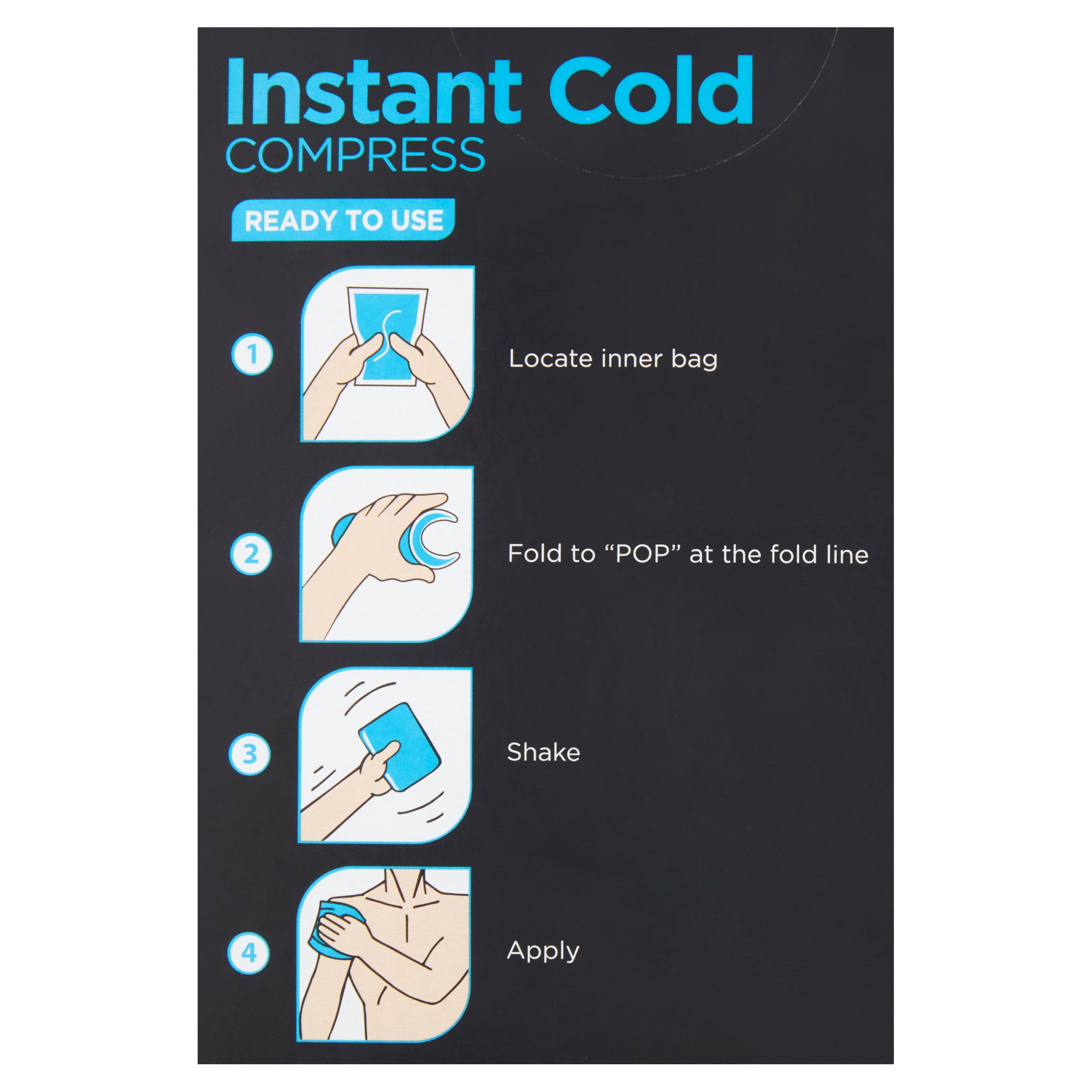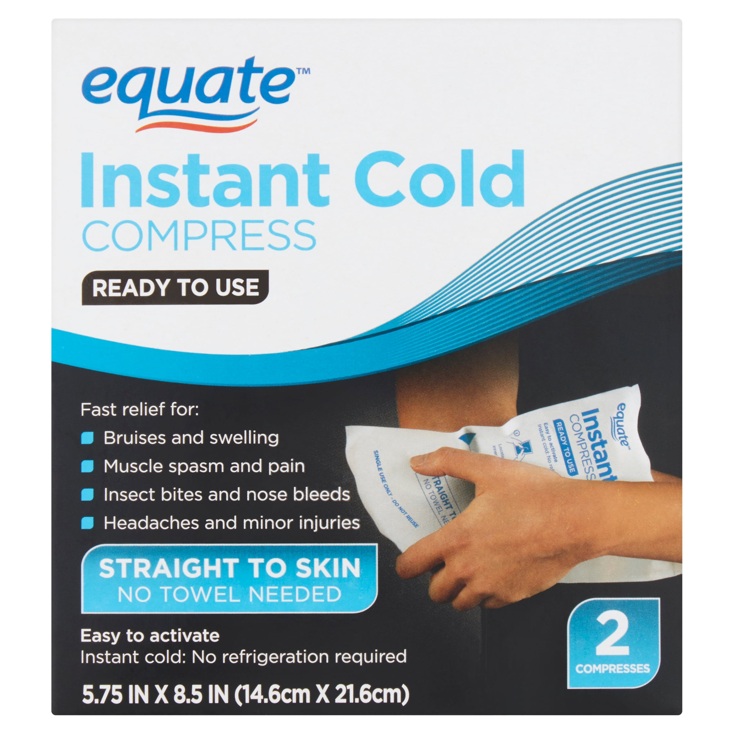 Life is full of bumps and bruises, and Equate Instant Cold Compress is an easy first step in pain relief. When you do not have a minute to spare, these easy-to-use compresses are there to deliver quick, cooling relief directly to all your aches and pains. Each box comes with 2 compresses, so you always have a backup on hand. You can apply these compresses to bruised or spasming muscles, insect bites, nosebleeds, or headaches. They are designed for direct contact on the skin, so no towel is necessary. These compresses do not require refrigeration, making them perfect for home or on the go. Simply open the package, bend the compress to pop the interior bag, shake vigorously, and apply directly to your affected area. The next time your aches and pains demand fast relief, make sure you have Equate Instant Cold Compress nearby.