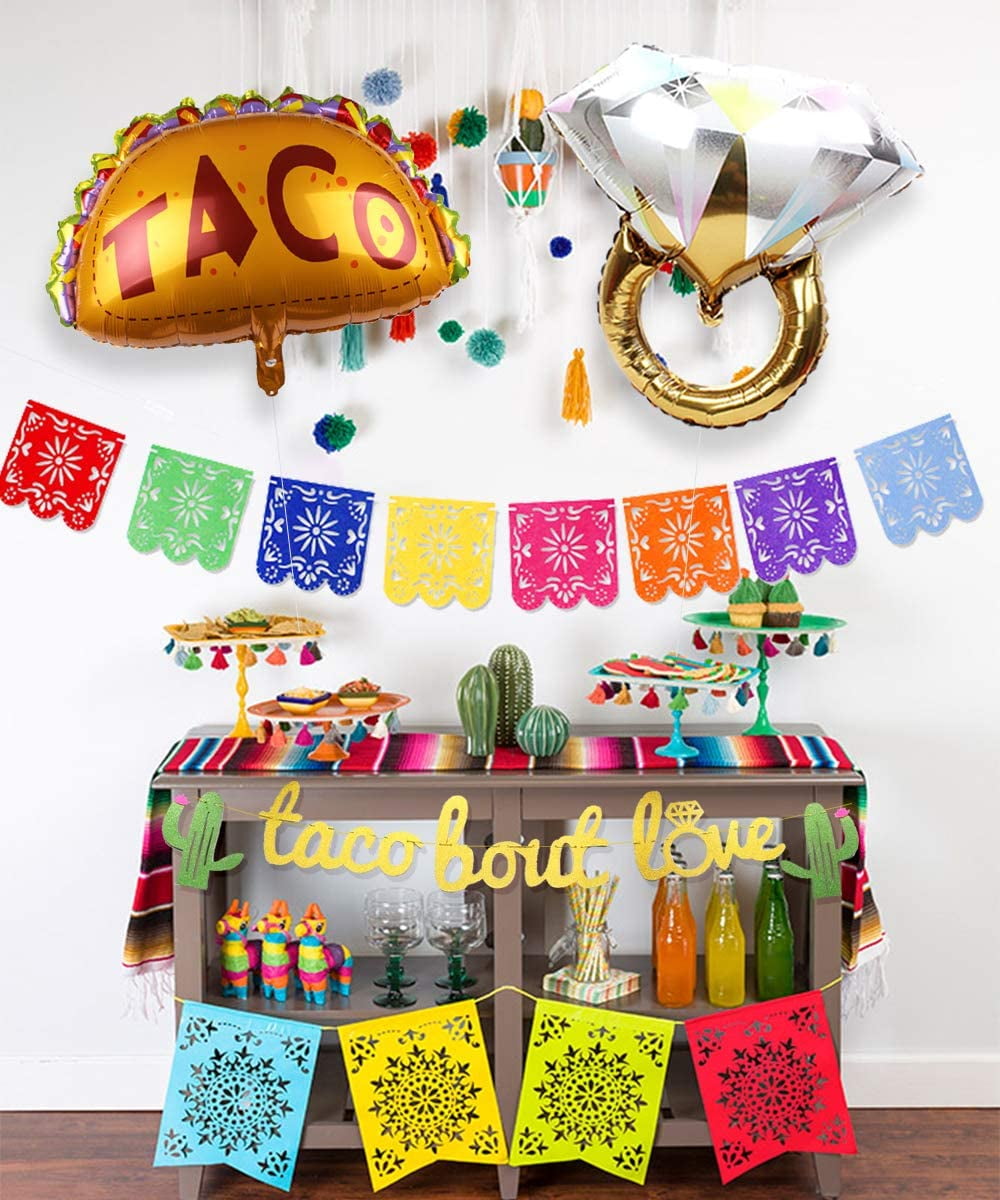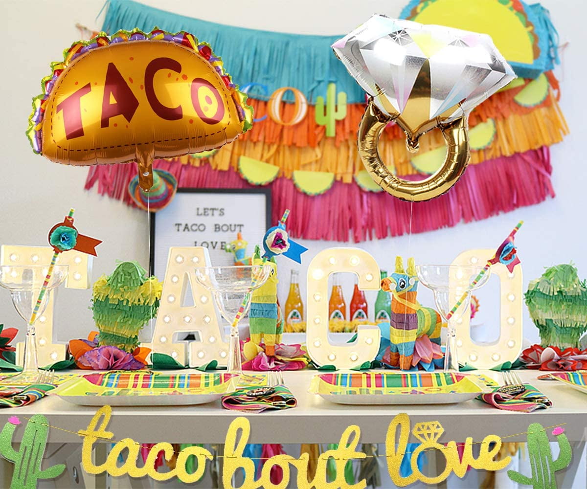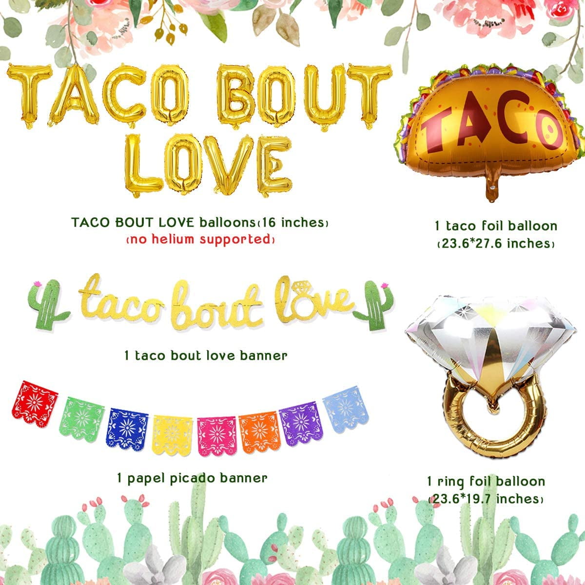 - Kit Includes: 16 inch gold TACO BOUT LOVE letter foil balloon, taco bout love cactus banner, 23.6”x19.7” diamond ring foil balloon, 23.6”x27.6” Taco foil balloon, papel picado banner.