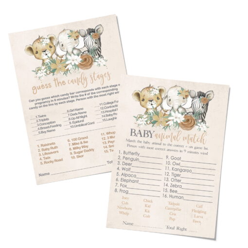 Flora Safari Baby Shower Game Card Bundle Pack for 25 Guests Includes Animal Matching and Candies Guessing Activity Set Royal Princess Greenery Theme Paper Clever Party