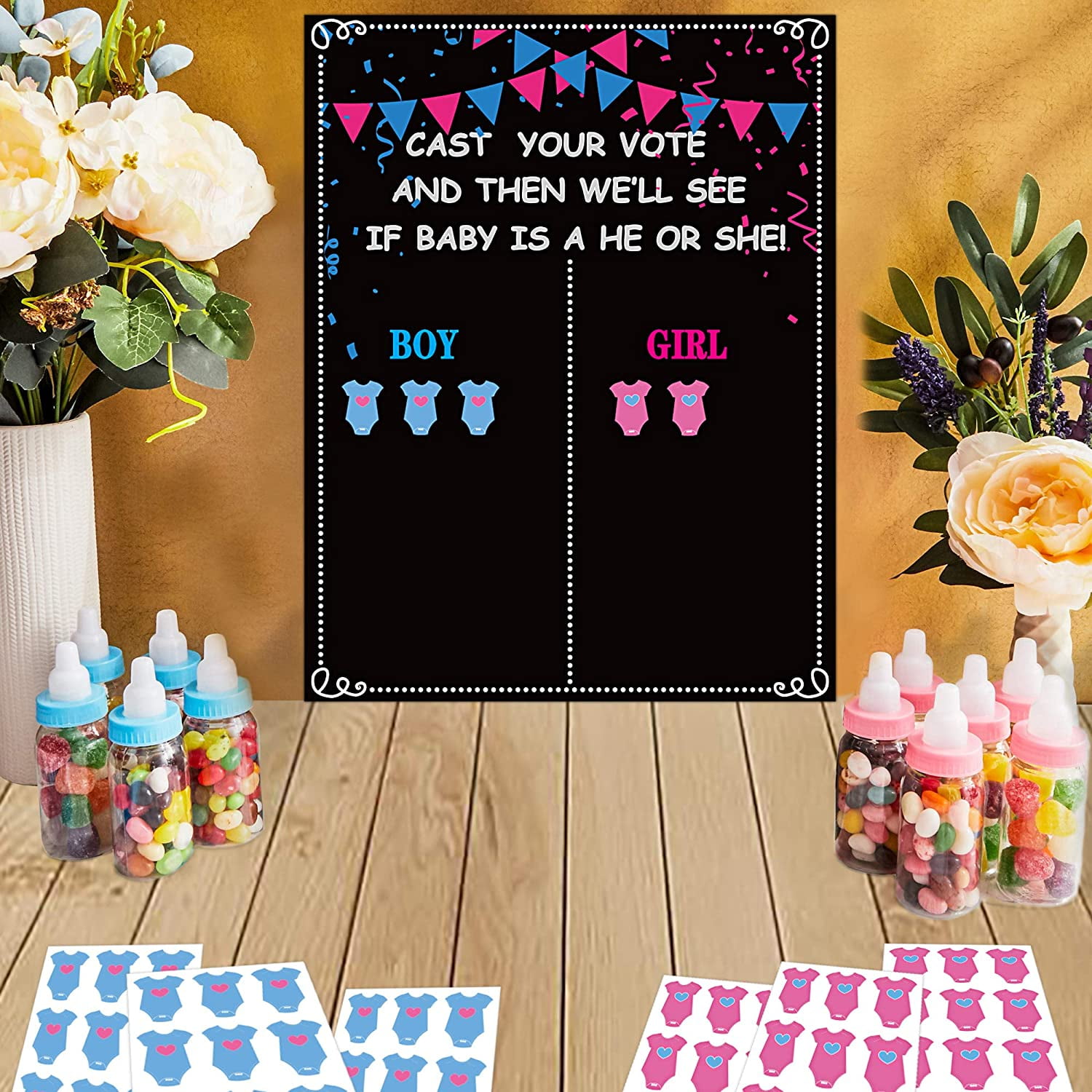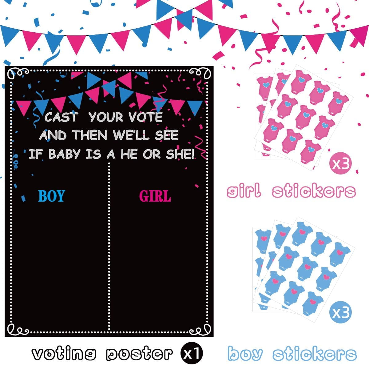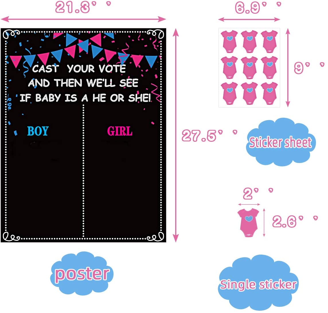 - Gender Reveal Party Games Poster Kit Includes: 1 Pcs big Gender reveal poster, 6 Sheets gender reveal voting stickers(total 54 Pcs, each sheet has 9 Pcs stickers). Let guests have fun guessing what the baby will be!