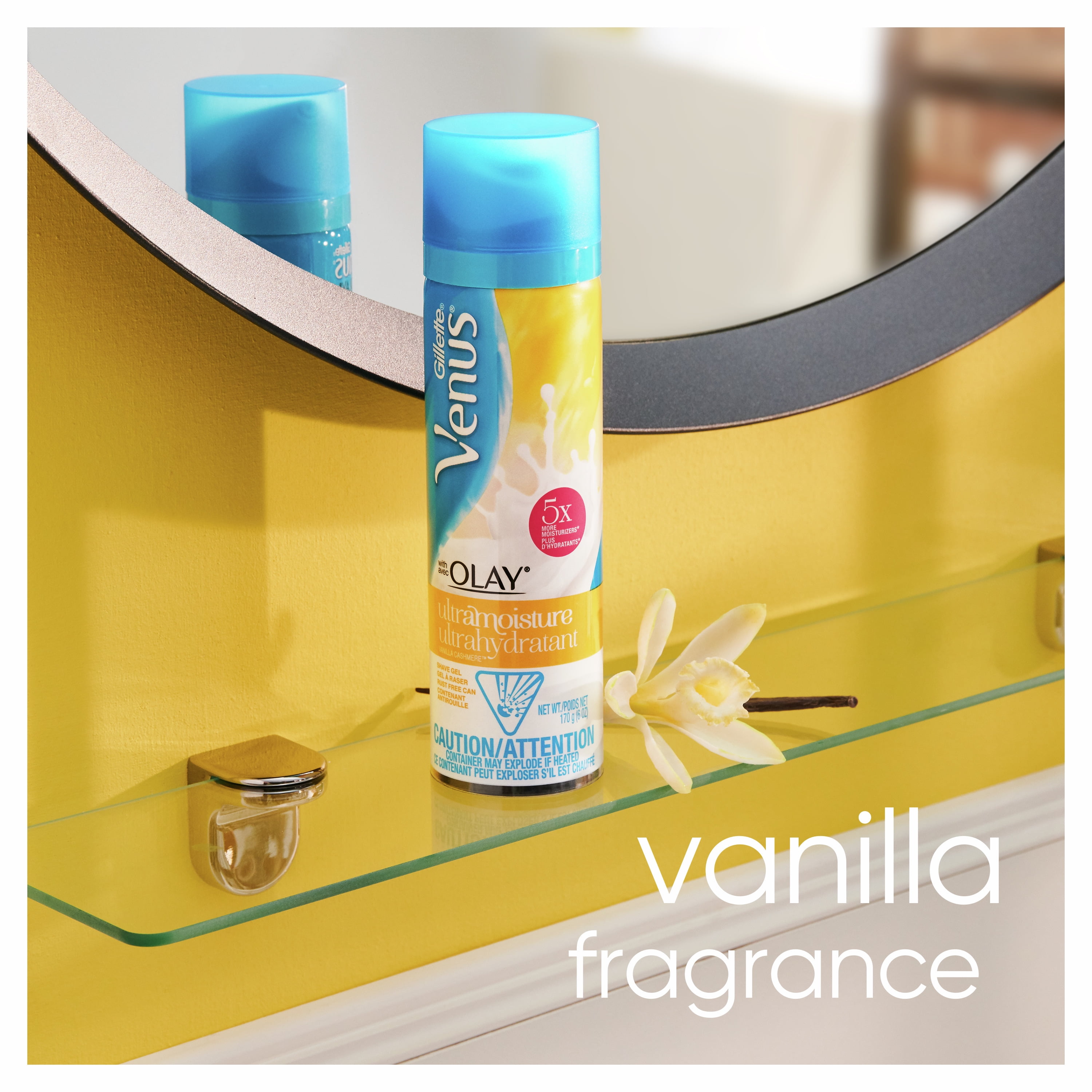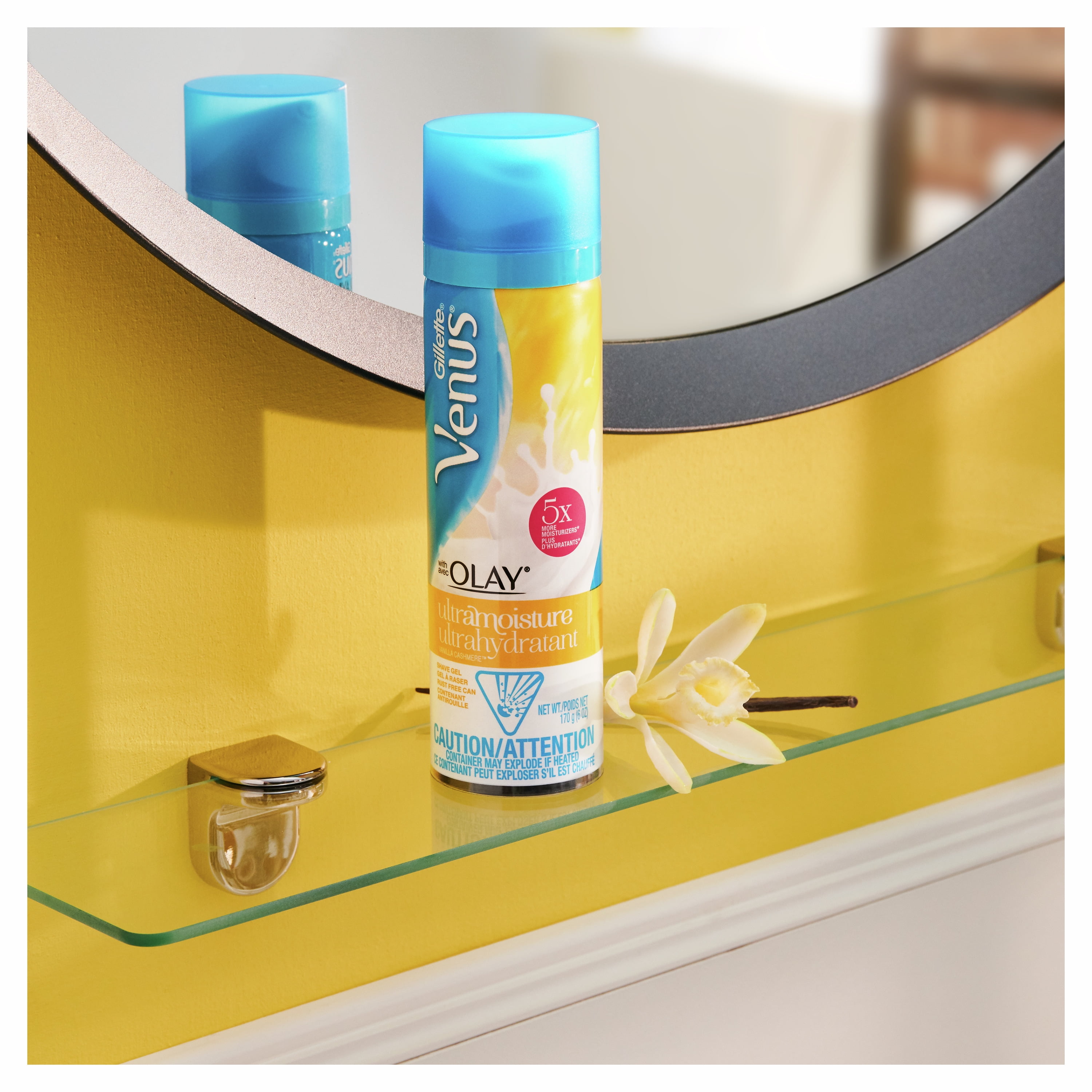 Venus products are designed with a woman’s body in mind. Venus with Olay UltraMoisture Vanilla Cashmere is a shaving gel for women with 5X MORE MOISTURIZERS (vs Ivory bar soap) to leave your skin feeling softer and smoother than ever. This pre-shave gel protects the skin against moisture loss during shaving, while also guarding against nicks, cuts and irritation. Remarkable coverage helps prevent missed spots and comes in an luxurious Vanilla Cashmere scent. Venus with Olay shave gel comes in a Rust-Free Can, so you don’t have to worry about rust rings in your shower. For great results, use with your favorite Gillette Venus razor. Gently rub shave gel over wet skin to produce a rich lather for a smooth shave. Rinse after shaving.