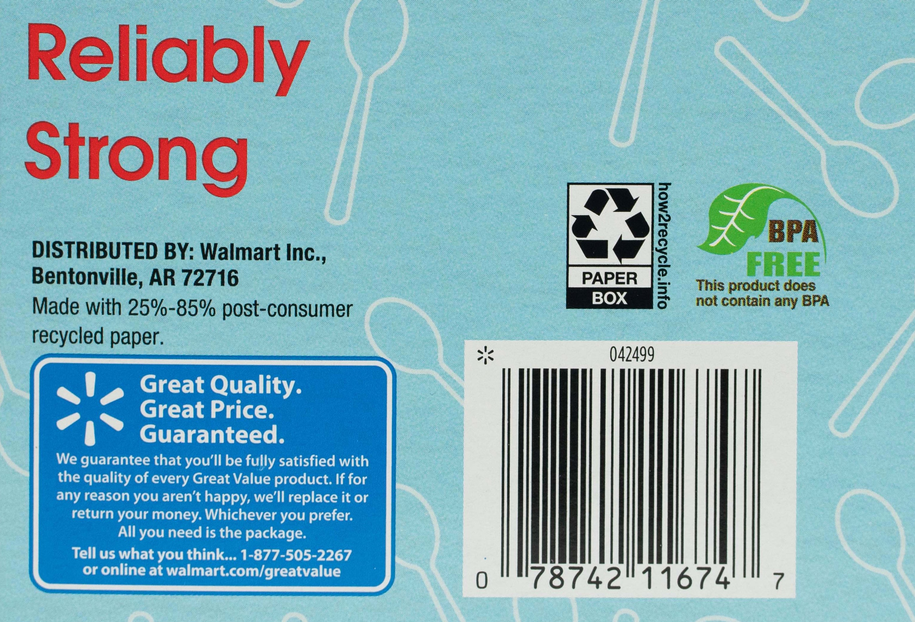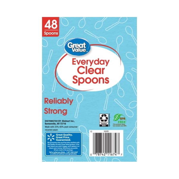 Great Value Everyday Clear Spoons are perfect for picnics, soup days, ice cream socials, dinners, and entertaining at home. Pack them in a lunch box, keep them at the office, or use them while on the go. This cutlery makes for quick and easy cleanup, so you can spend more time enjoying your company. These clear plastic spoons come in a 48-count box and are a superb addition to your kitchen or break room cupboard. Our spoons are reliably strong and BPA free, so you know you’re getting the best in both quality and safety. When you need affordable, quality flatware for your next gathering, reach for our Great Value Everyday Clear Spoons. Great Value products provide families with affordable, high quality grocery and household consumable options. With our wide range of product categories spanning grocery and household consumables, we offer you a variety of products for your family’s needs. Our products are conveniently available online and in Walmart stores nationwide, allowing you to stock up and save money at the same time.