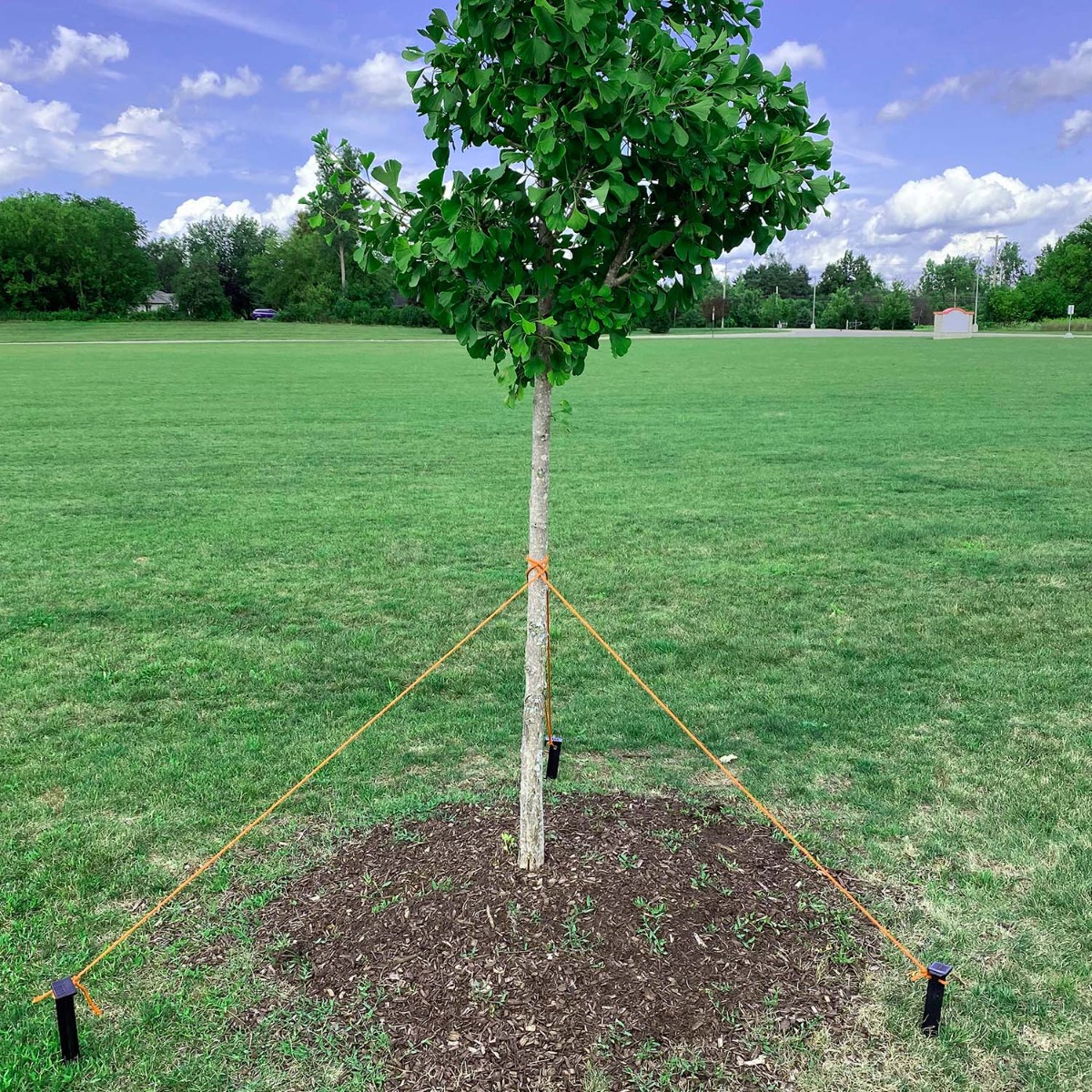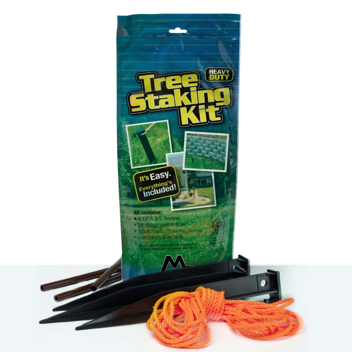 Grow healthy and tall trees with the heavy duty tree staking kit. This kit includes a 30-ft. roll of high visibility rope, three 15-in. anchors and three protective sleeves. This non-rigid kit allows young and transplanted trees to thrive in their new locations. The soft plastic sleeves protect against the elements and nibbling critters. It is designed to provide non-intrusive support to help the trunk grow naturally strong and straight while keeping the roots intact. Installation is easy and do-it-yourself friendly.