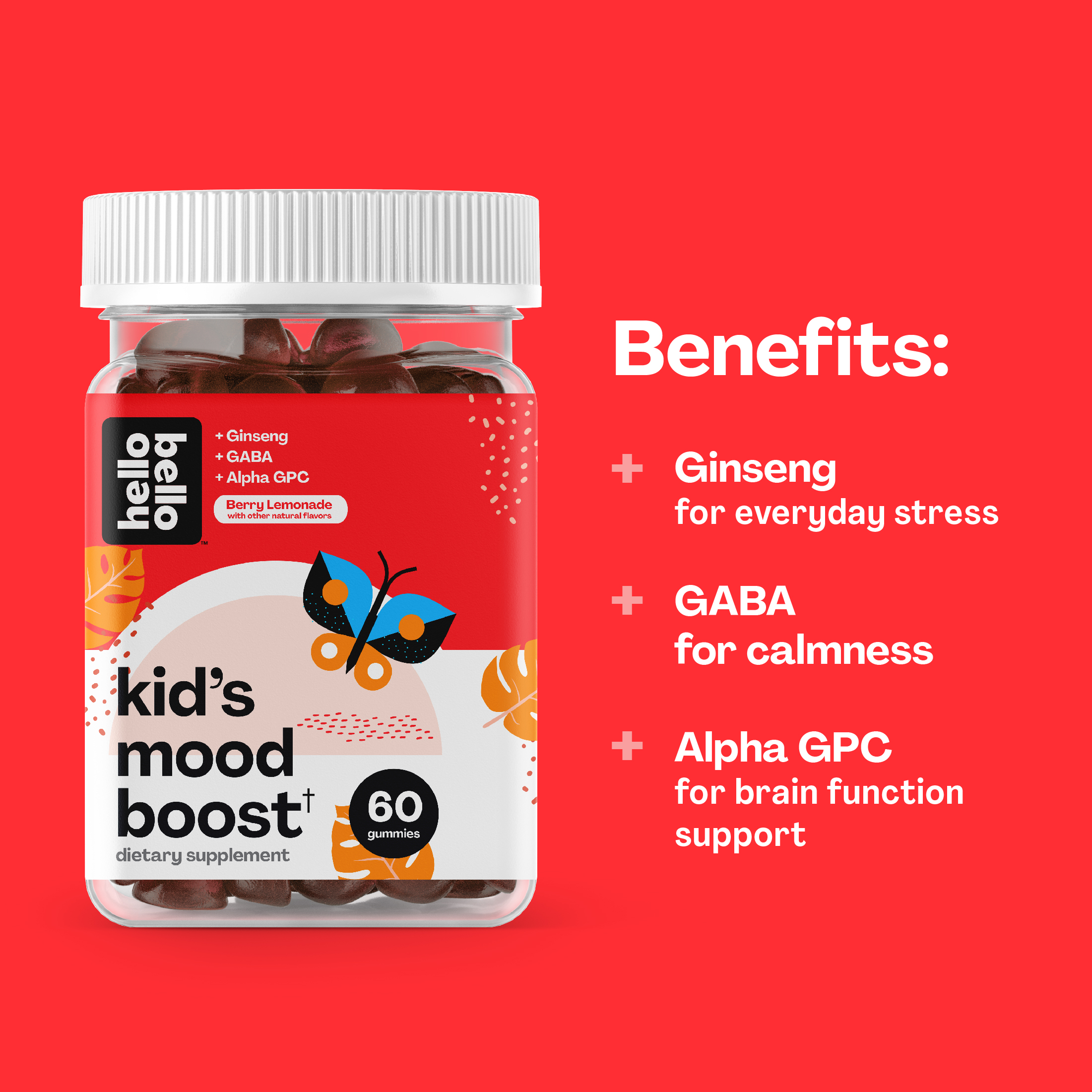 Chill time, without the screen time. It’s tough being a kiddo. Yes, kids get stressed too. That’s why Hello Bello developed Kids Mood Boost gummies, packed with mood-boosting ingredients to help our tiny humans with moodiness and well, balance. There’s a lot going on in those little noggins, and we’re supporting them with ingredients like: Ginseng: Ginseng use goes back 5,000 years and among its many benefits, it helps relieve everyday stress. GABA: GABA is naturally found in kiddos brains, and helps regulate how brain cells talk to one another (specifically by telling them, "Shhhh, calm down.") Alpha GPC: Choline is a cognitive cool kid that’s vital for brain function, and Alpha GPC helps boost the natural levels of choline in your little one’s noggin. With Hello Bello premium vitamins available at Walmart, families everywhere can start their mornings and end their days with a Hello Bello vita-minute—because everyone deserves the best vitamins at the best value.Featuring: Ginseng for everyday stress GABA for calmness Alpha GPC for brain function support EXTRA DELICIOUS NUTRITIOUSNESS: Natural fruity flavors make taking Hello Bello vitamins a delight instead of a drag – making it easier for you to help fill nutritional gaps. EXTRA HAPPY FAMILIES: Nothing’s better than when what’s good for you is also something you crave and enjoy – and Hello Bello gummy vitamins are completely crave-worthy and enjoyable. PREMIUM QUALITY, AFFORDABLE PRICE: At Hello Bello we’re on a mission to create premium quality products at non-premium prices because we believe every family deserves the best. MADE WITHOUT: – Artificial colors and flavors – High fructose corn syrup – Common allergens (wheat, gluten, eggs, peanuts) – Gelatin