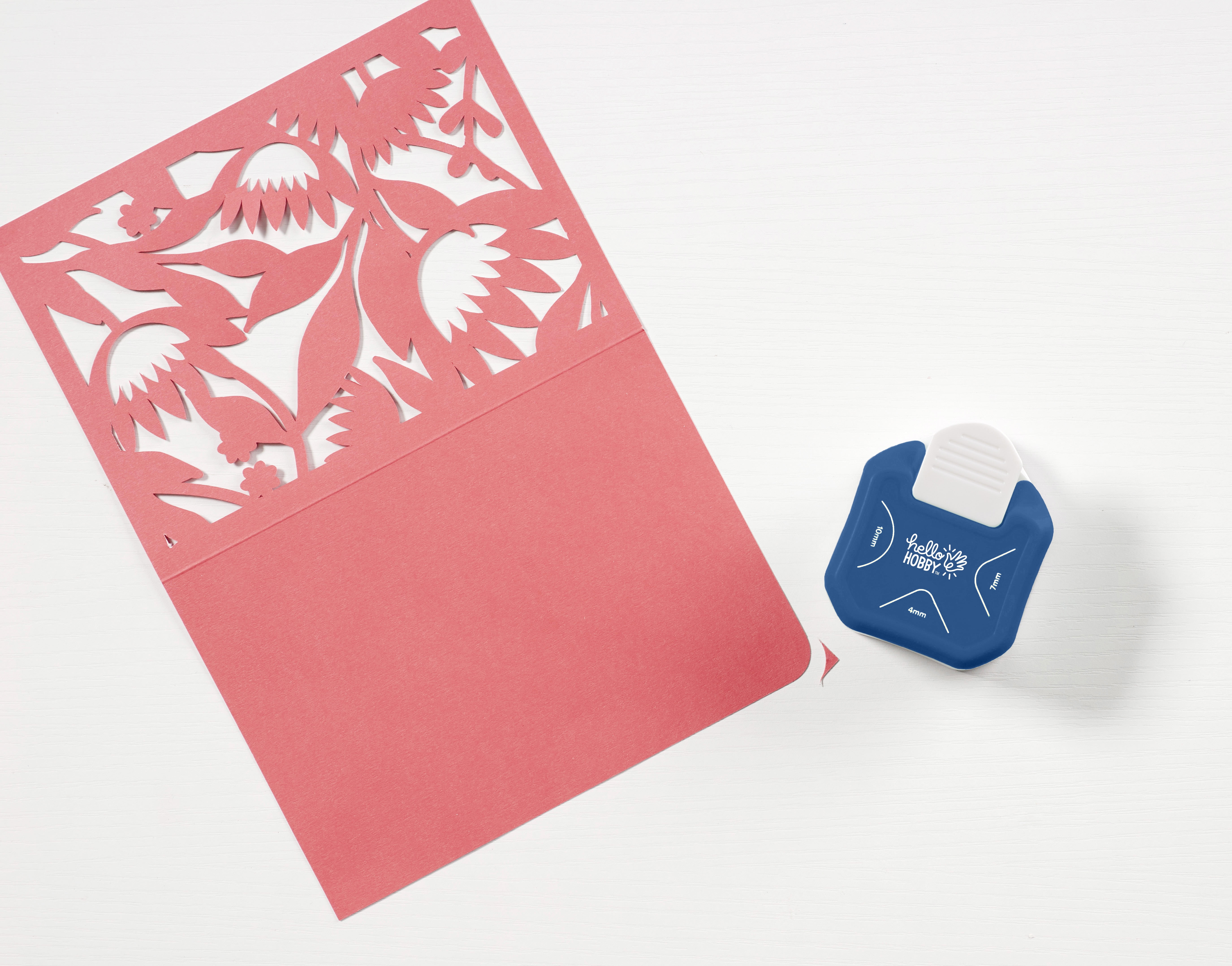 The Hello Hobby 3-Way Corner Punch is the perfect tool to add to your cardmaking and paper crafting collection. The 3-Way Corner Punch is easy to use and cuts 4 mm/small, 7mm/medium, and 10mm/large round effect corners on craft paper. The 3-Way Corner Punch leaves a nice corner cut and is effortless, even on cardstock.