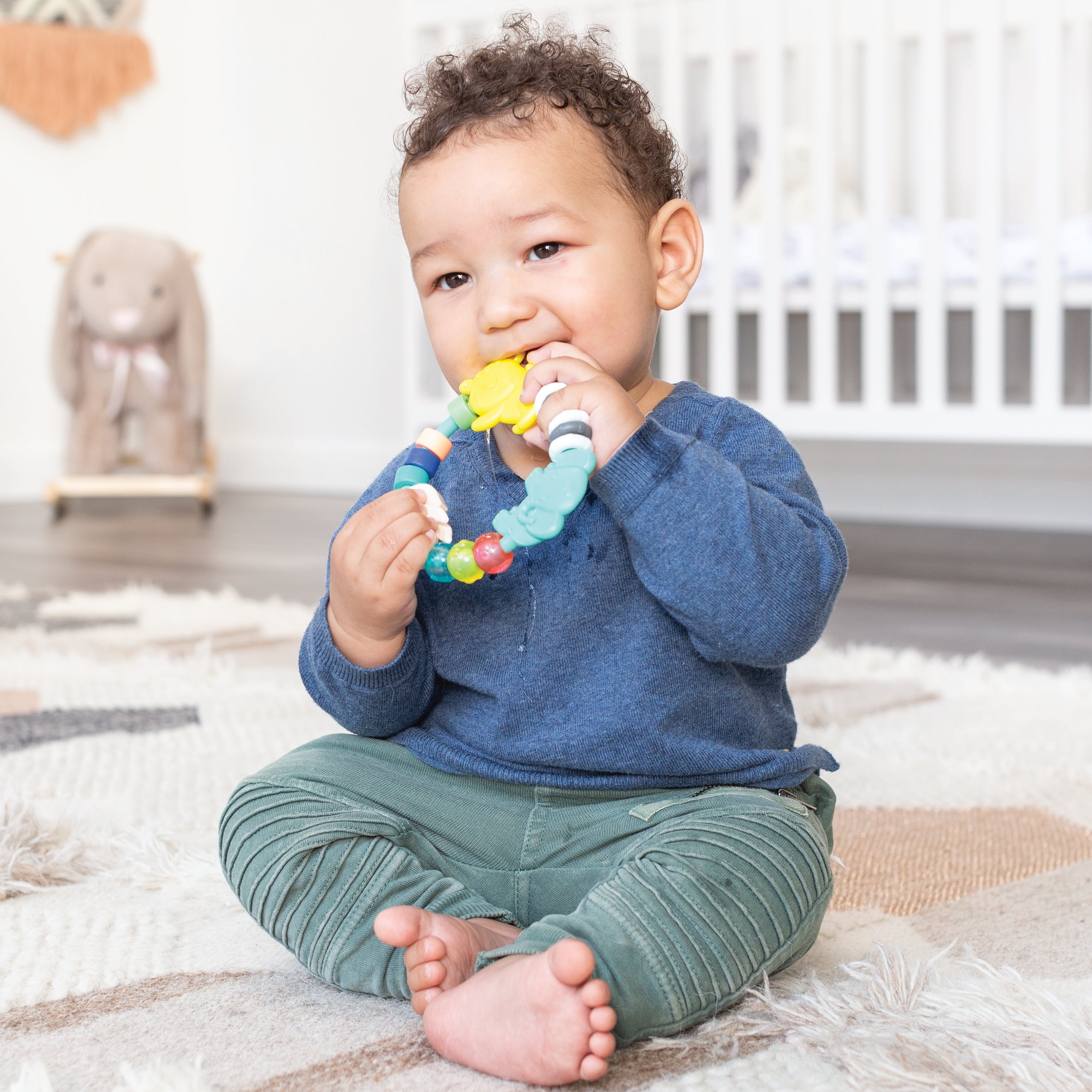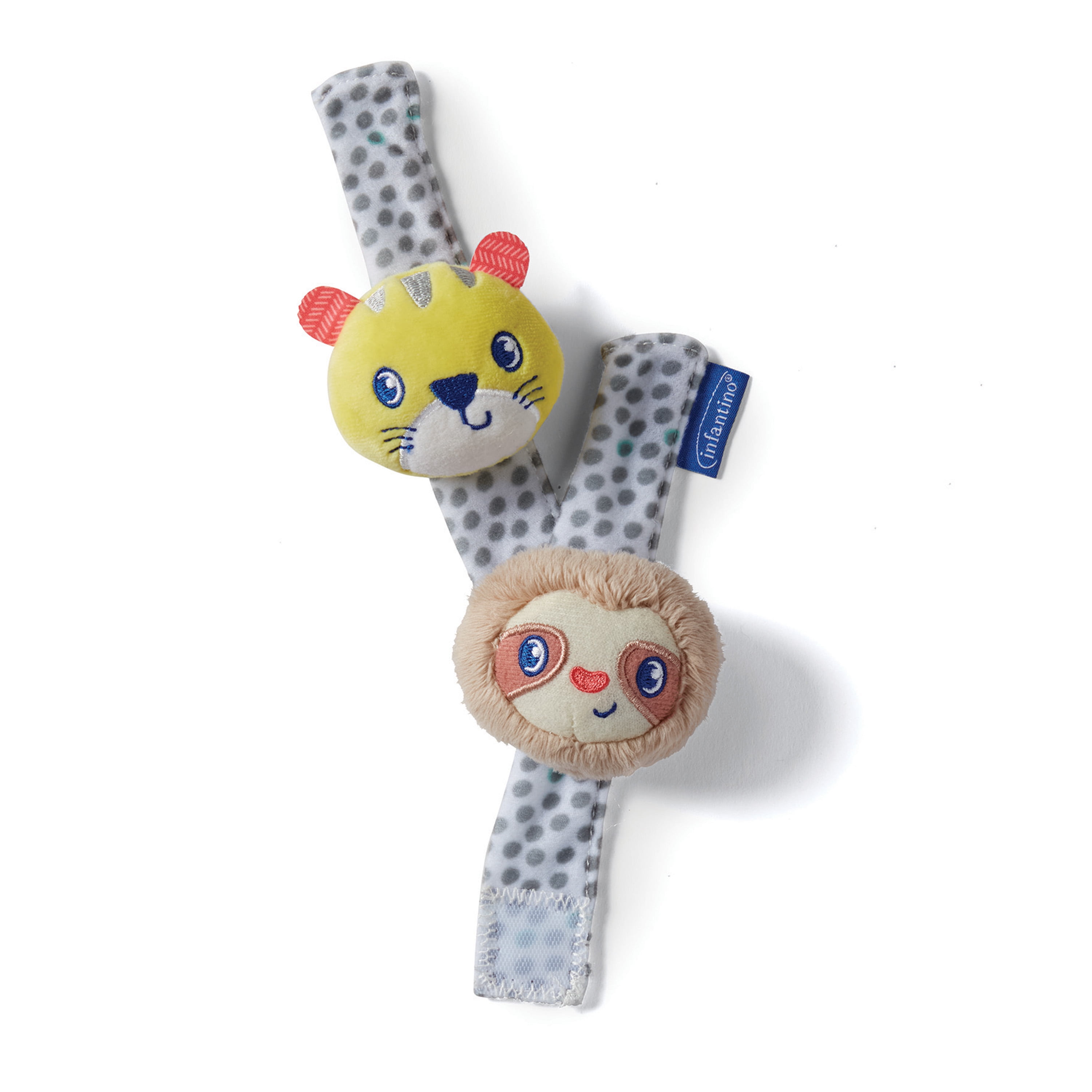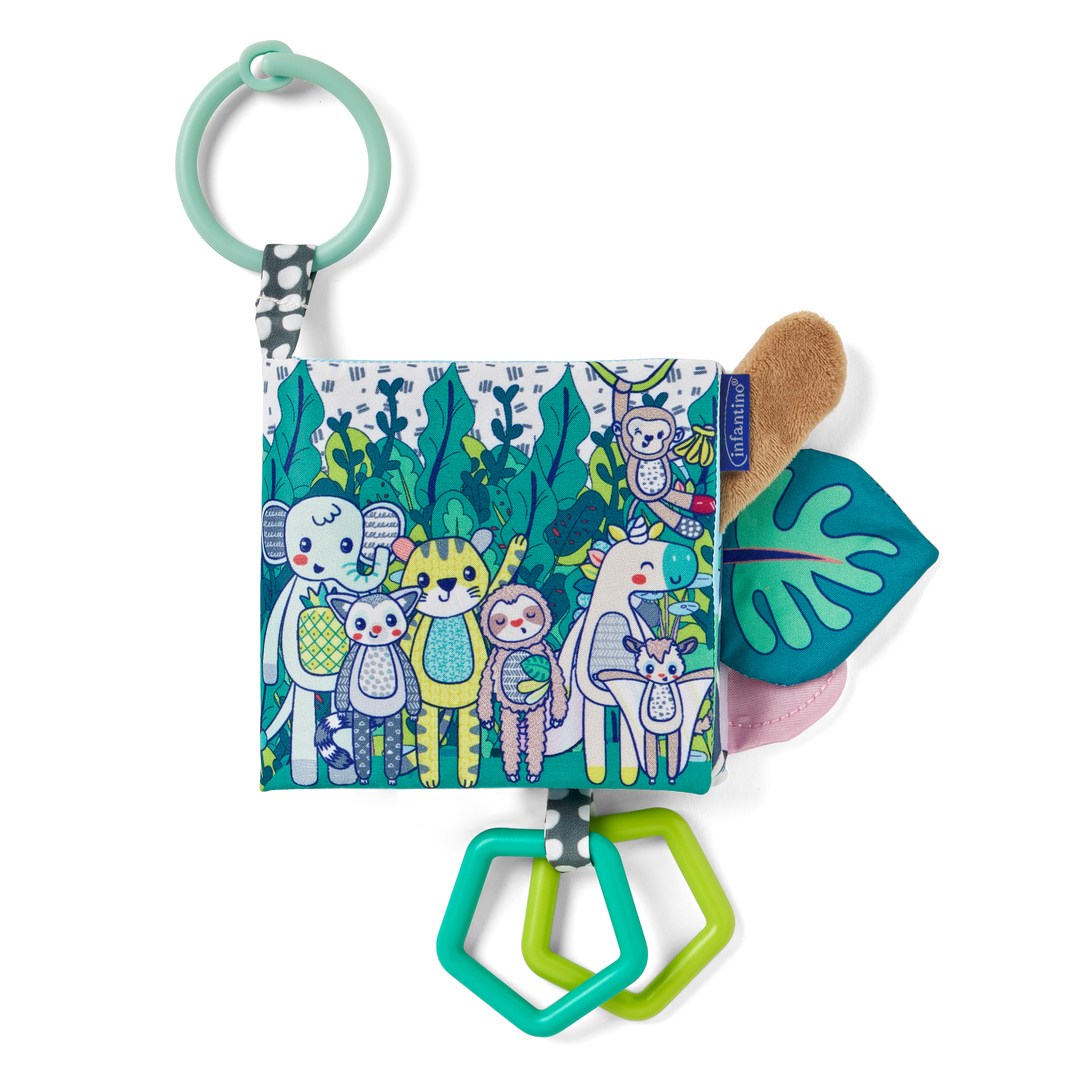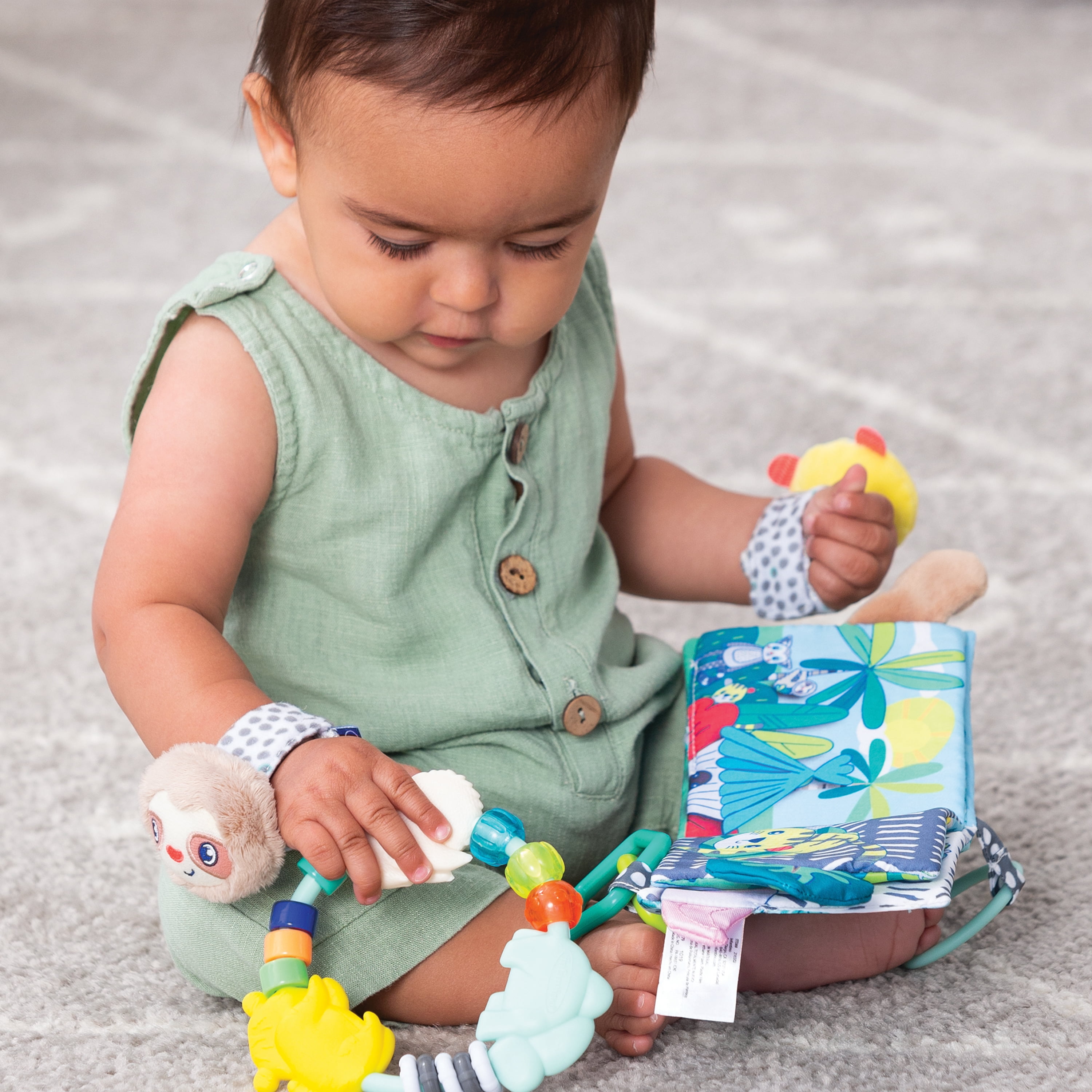 This set of multi-functional baby must haves is filled with sensory surprises. Perfect for promoting visual, auditory and tactile development. Includes an activity soft book, two wrist rattles, and a soothing bead teether ring.Infantino Sights & Sounds Sensory Gift Set