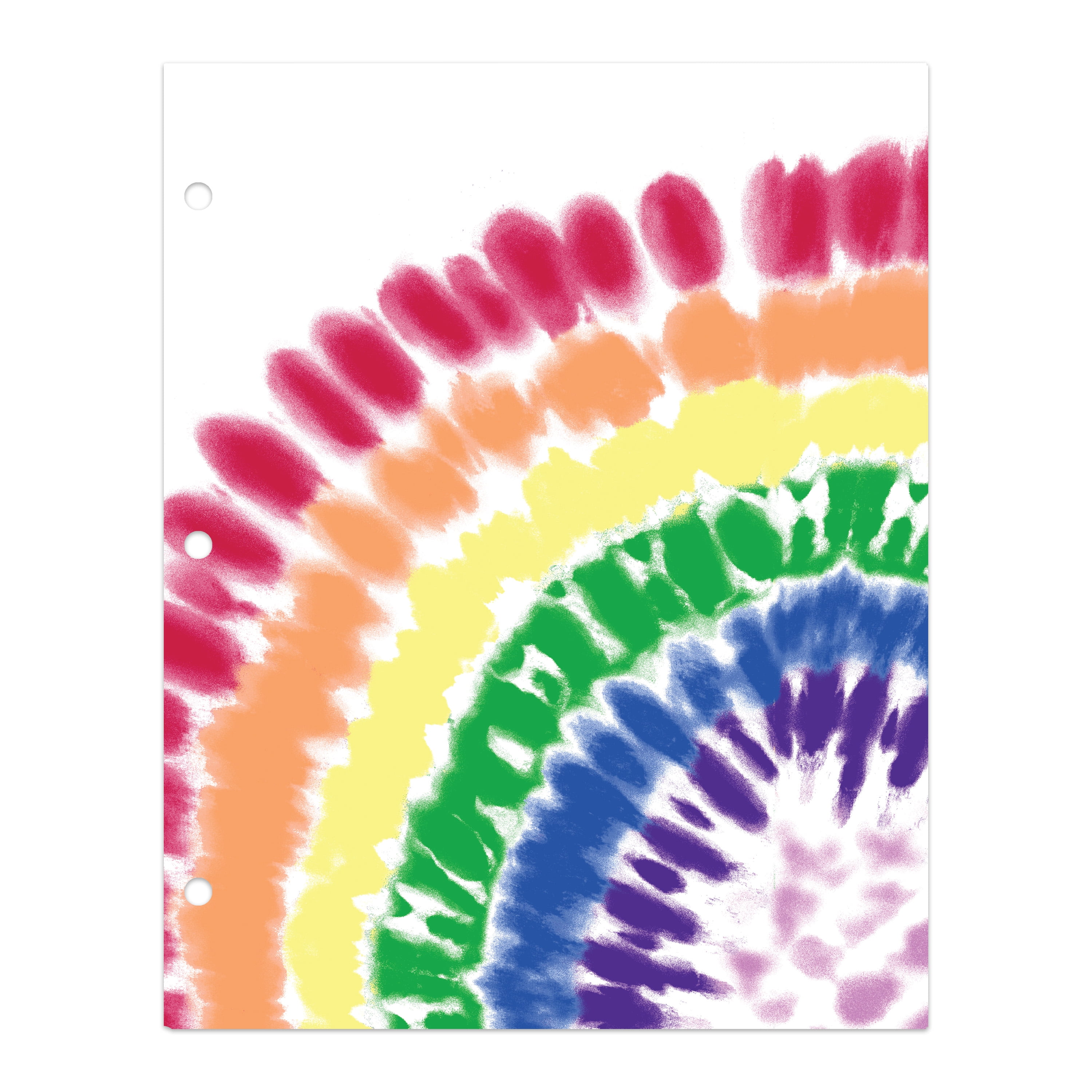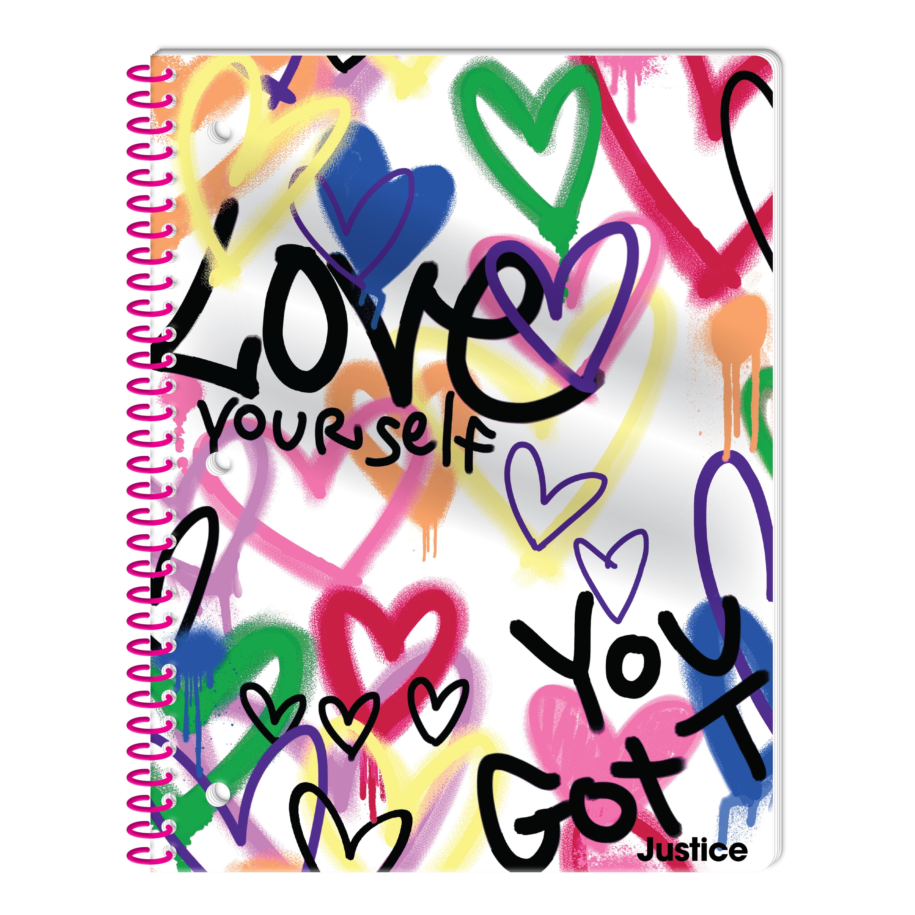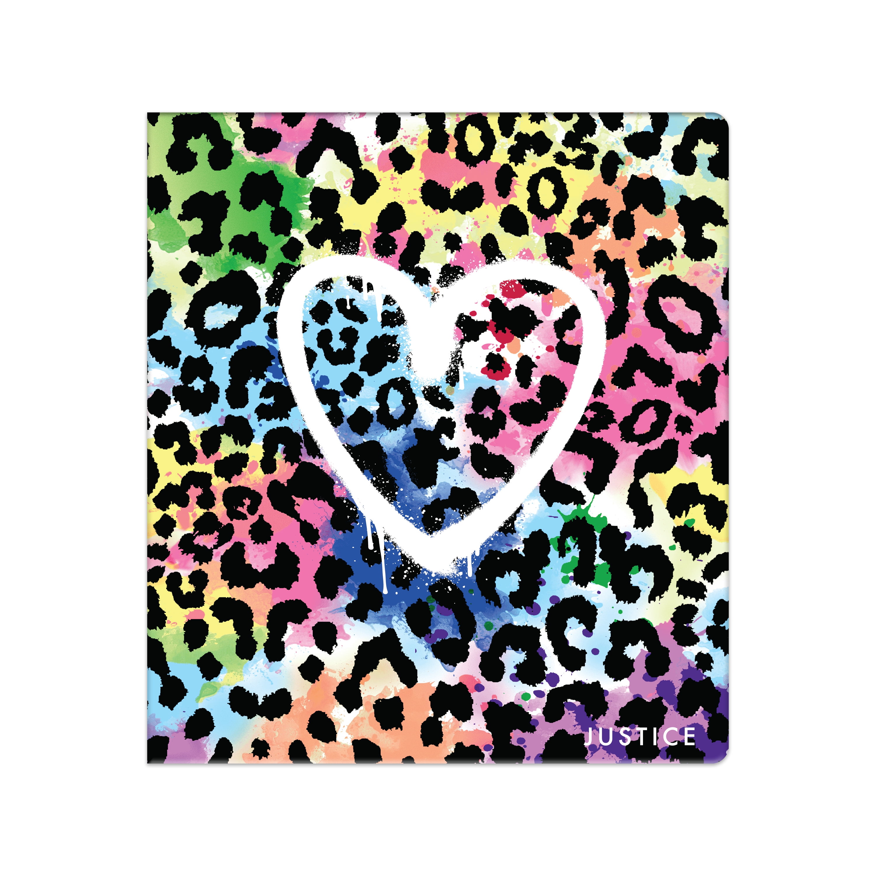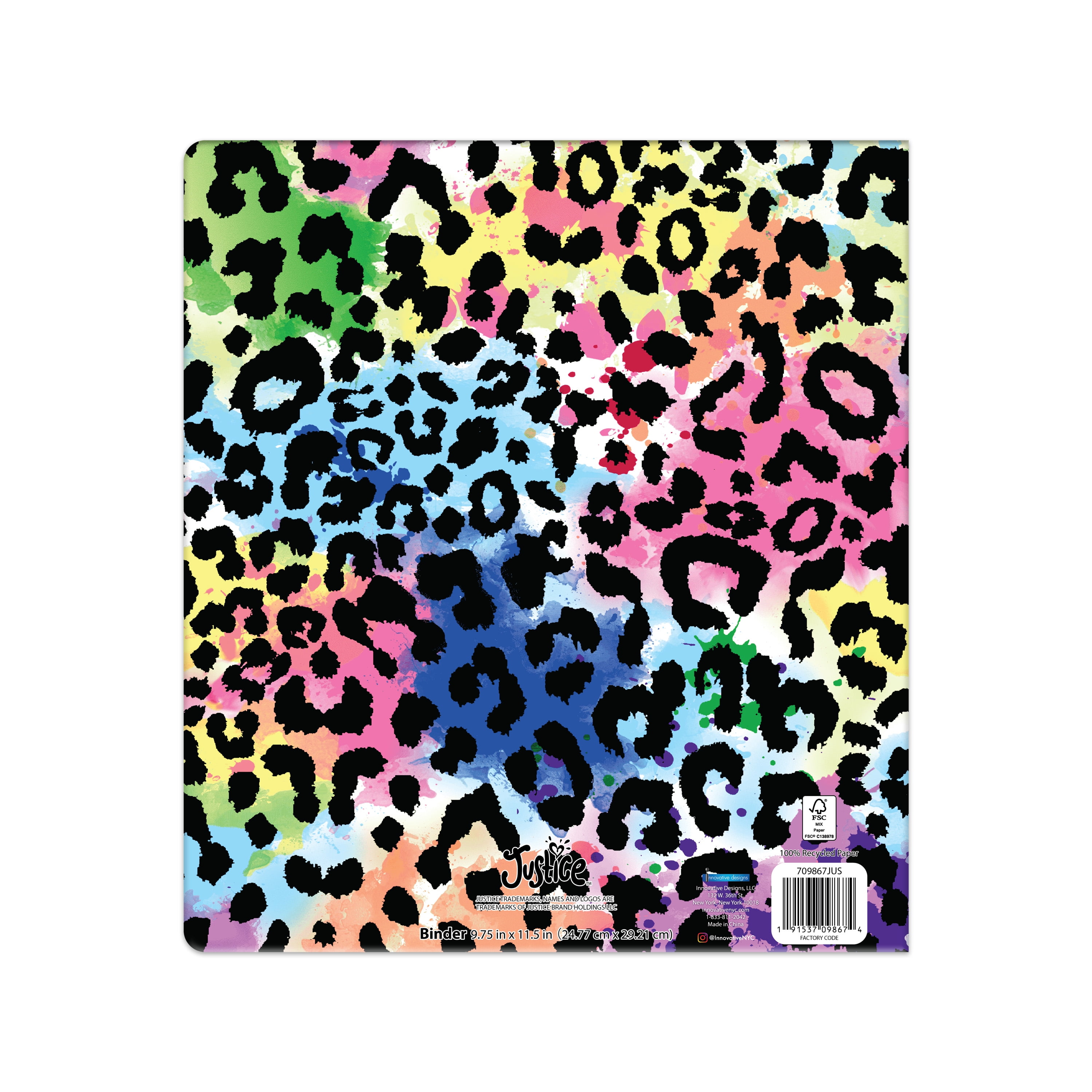 The Justice Rainbow Stationery Bundle, 3-Ring, 1" Binder, Spiral Notebook, Folder has everything you need to start the school year off right. This awesome bundle includes a 1-inch binder, a 1-subject spiral notebook, and a 2-pocket paper folder. Each piece is uniquely styled with designs inspired by the red-orange-yellow-green-blue-purple color pattern found in a rainbow. The Binder is covered in a shiny rainbow cheetah pattern. A rainbow tie-dye design with glitter accents adorns the paper folder. The spiral notebook has multi-colored hearts and words, including "Love Yourself" and "You Got This" in a graffiti style print adorned with shiny accents. All Stationery is composed of FSC mixed certified paper.